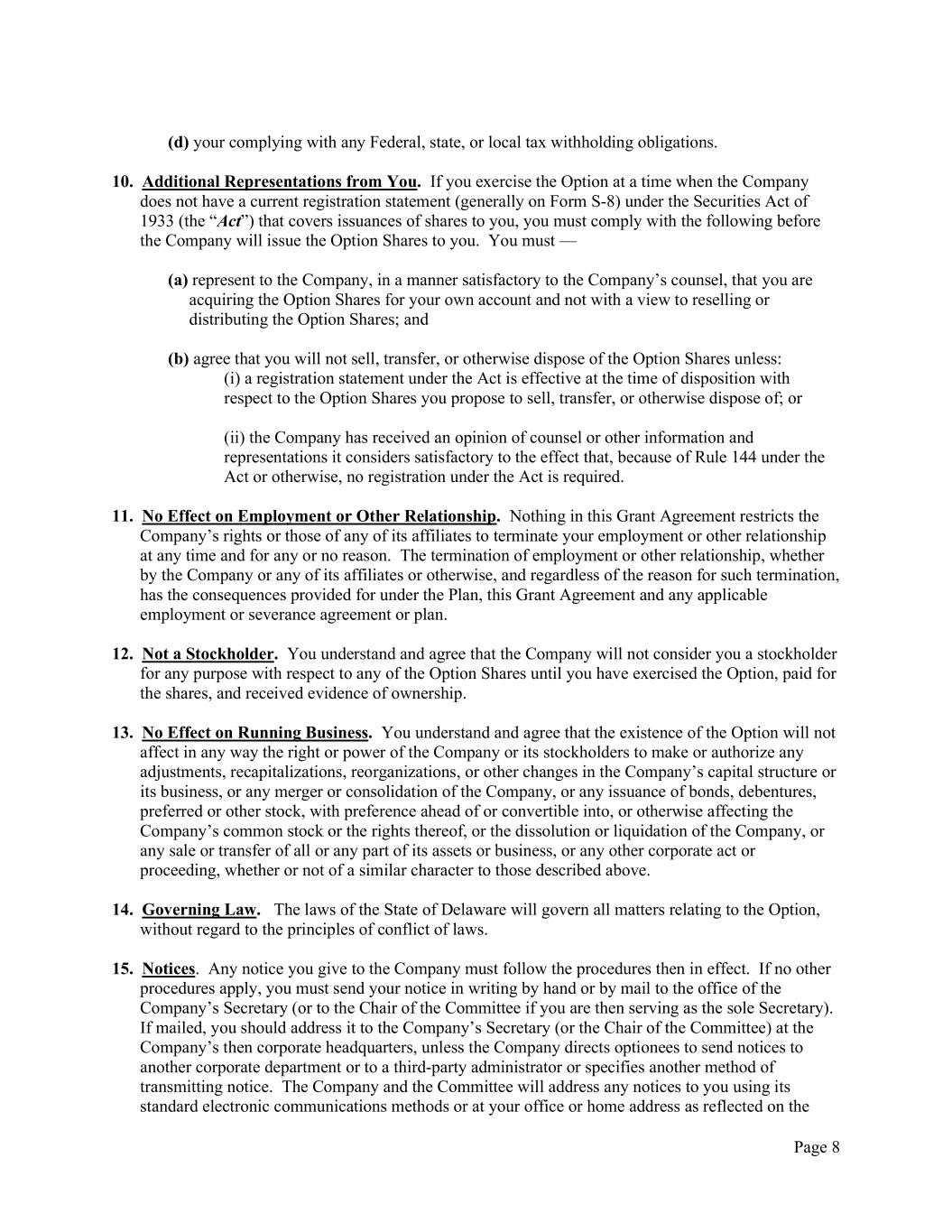 Page 8 (d) your complying with any Federal, state, or local tax withholding obligations. 10. Additional Representations from You. If you exercise the Option at a time when the Company does not have a current registration statement (generally on Form S-8) under the Securities Act of 1933 (the “Act”) that covers issuances of shares to you, you must comply with the following before the Company will issue the Option Shares to you. You must — (a) represent to the Company, in a manner satisfactory to the Company’s counsel, that you are acquiring the Option Shares for your own account and not with a view to reselling or distributing the Option Shares; and (b) agree that you will not sell, transfer, or otherwise dispose of the Option Shares unless: (i) a registration statement under the Act is effective at the time of disposition with respect to the Option Shares you propose to sell, transfer, or otherwise dispose of; or (ii) the Company has received an opinion of counsel or other information and representations it considers satisfactory to the effect that, because of Rule 144 under the Act or otherwise, no registration under the Act is required. 11. No Effect on Employment or Other Relationship. Nothing in this Grant Agreement restricts the Company’s rights or those of any of its affiliates to terminate your employment or other relationship at any time and for any or no reason. The termination of employment or other relationship, whether by the Company or any of its affiliates or otherwise, and regardless of the reason for such termination, has the consequences provided for under the Plan, this Grant Agreement and any applicable employment or severance agreement or plan. 12. Not a Stockholder. You understand and agree that the Company will not consider you a stockholder for any purpose with respect to any of the Option Shares until you have exercised the Option, paid for the shares, and received evidence of ownership. 13. No Effect on Running Business. You understand and agree that the existence of the Option will not affect in any way the right or power of the Company or its stockholders to make or authorize any adjustments, recapitalizations, reorganizations, or other changes in the Company’s capital structure or its business, or any merger or consolidation of the Company, or any issuance of bonds, debentures, preferred or other stock, with preference ahead of or convertible into, or otherwise affecting the Company’s common stock or the rights thereof, or the dissolution or liquidation of the Company, or any sale or transfer of all or any part of its assets or business, or any other corporate act or proceeding, whether or not of a similar character to those described above. 14. Governing Law. The laws of the State of Delaware will govern all matters relating to the Option, without regard to the principles of conflict of laws. 15. Notices. Any notice you give to the Company must follow the procedures then in effect. If no other procedures apply, you must send your notice in writing by hand or by mail to the office of the Company’s Secretary (or to the Chair of the Committee if you are then serving as the sole Secretary). If mailed, you should address it to the Company’s Secretary (or the Chair of the Committee) at the Company’s then corporate headquarters, unless the Company directs optionees to send notices to another corporate department or to a third-party administrator or specifies another method of transmitting notice. The Company and the Committee will address any notices to you using its standard electronic communications methods or at your office or home address as reflected on the