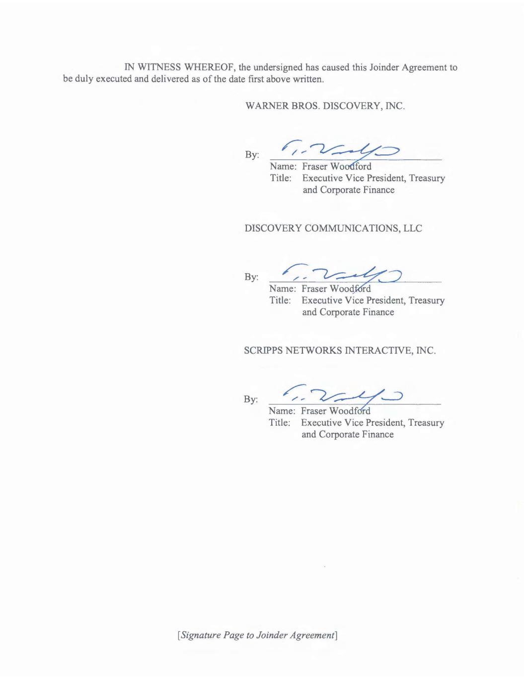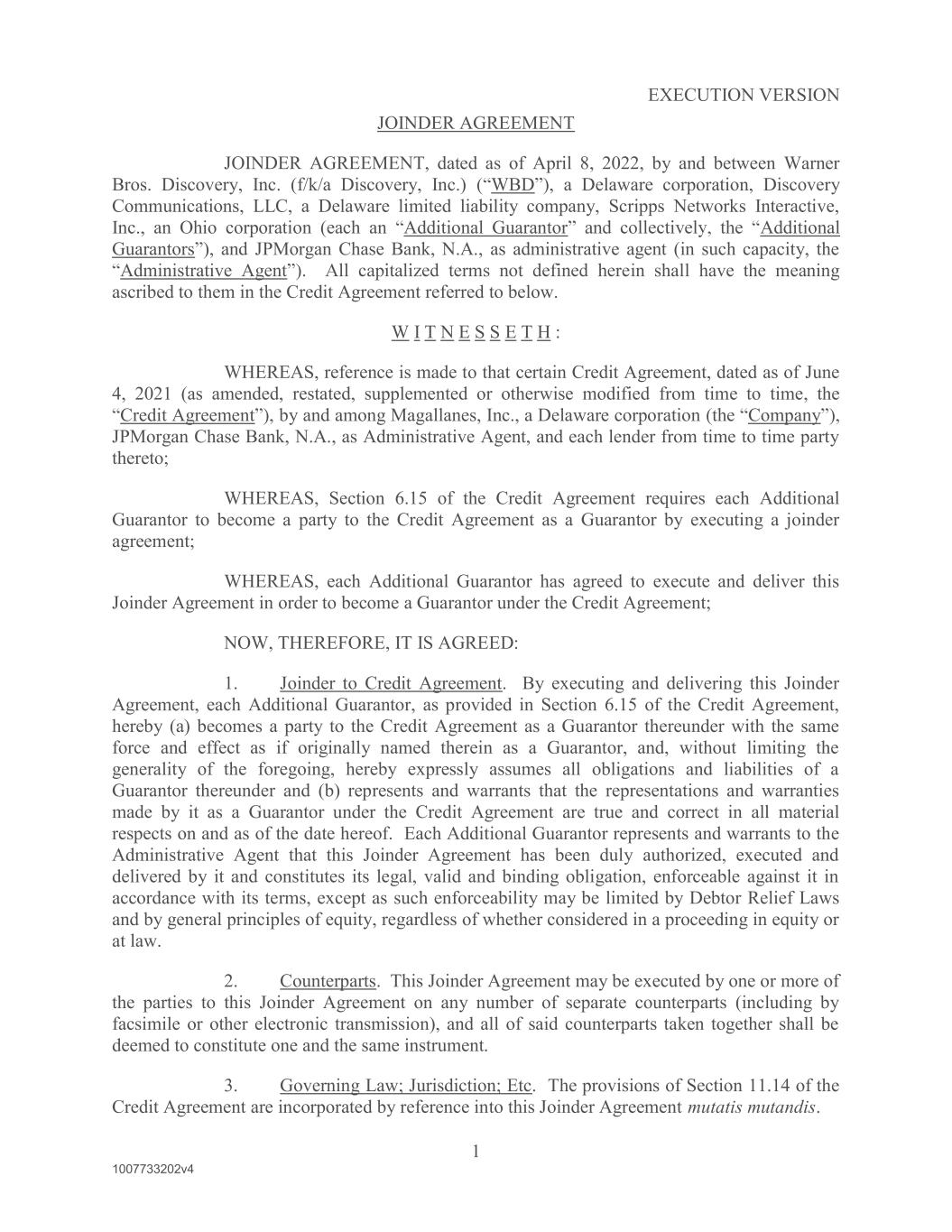 EXECUTION VERSION 1 1007733202v4 JOINDER AGREEMENT JOINDER AGREEMENT, dated as of April 8, 2022, by and between Warner Bros. Discovery, Inc. (f/k/a Discovery, Inc.) WBD , a Delaware corporation, Discovery Communications, LLC, a Delaware limited liability company, Scripps Networks Interactive, Inc., an Ohio corporation (each an Additional Guarantor Additional Guarantors ), and JPMorgan Chase Bank, N.A., as administrative agent (in such capacity, the Administrative Agent in shall have the meaning ascribed to them in the Credit Agreement referred to below. W I T N E S S E T H : WHEREAS, reference is made to that certain Credit Agreement, dated as of June 4, 2021 (as amended, restated, supplemented or otherwise modified from time to time, the Credit Agreement by and among Magallanes, Inc., a Delaware corporation Company JPMorgan Chase Bank, N.A., as Administrative Agent, and each lender from time to time party thereto; WHEREAS, Section 6.15 of the Credit Agreement requires each Additional Guarantor to become a party to the Credit Agreement as a Guarantor by executing a joinder agreement; WHEREAS, each Additional Guarantor has agreed to execute and deliver this Joinder Agreement in order to become a Guarantor under the Credit Agreement; NOW, THEREFORE, IT IS AGREED: 1. Joinder to Credit Agreement. By executing and delivering this Joinder Agreement, each Additional Guarantor, as provided in Section 6.15 of the Credit Agreement, hereby (a) becomes a party to the Credit Agreement as a Guarantor thereunder with the same force and effect as if originally named therein as a Guarantor, and, without limiting the generality of the foregoing, hereby expressly assumes all obligations and liabilities of a Guarantor thereunder and (b) represents and warrants that the representations and warranties made by it as a Guarantor under the Credit Agreement are true and correct in all material respects on and as of the date hereof. Each Additional Guarantor represents and warrants to the Administrative Agent that this Joinder Agreement has been duly authorized, executed and delivered by it and constitutes its legal, valid and binding obligation, enforceable against it in accordance with its terms, except as such enforceability may be limited by Debtor Relief Laws and by general principles of equity, regardless of whether considered in a proceeding in equity or at law. 2. Counterparts. This Joinder Agreement may be executed by one or more of the parties to this Joinder Agreement on any number of separate counterparts (including by facsimile or other electronic transmission), and all of said counterparts taken together shall be deemed to constitute one and the same instrument. 3. Governing Law; Jurisdiction; Etc. The provisions of Section 11.14 of the Credit Agreement are incorporated by reference into this Joinder Agreement mutatis mutandis.