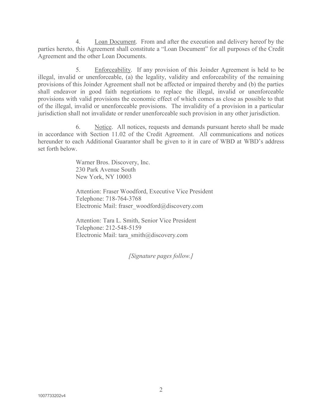 2 1007733202v4 4. Loan Document. From and after the execution and delivery hereof by the urposes of the Credit Agreement and the other Loan Documents. 5. Enforceability. If any provision of this Joinder Agreement is held to be illegal, invalid or unenforceable, (a) the legality, validity and enforceability of the remaining provisions of this Joinder Agreement shall not be affected or impaired thereby and (b) the parties shall endeavor in good faith negotiations to replace the illegal, invalid or unenforceable provisions with valid provisions the economic effect of which comes as close as possible to that of the illegal, invalid or unenforceable provisions. The invalidity of a provision in a particular jurisdiction shall not invalidate or render unenforceable such provision in any other jurisdiction. 6. Notice. All notices, requests and demands pursuant hereto shall be made in accordance with Section 11.02 of the Credit Agreement. All communications and notices hereunder to each Additional Guarantor shall be given to it in care of WBD at address set forth below. Warner Bros. Discovery, Inc. 230 Park Avenue South New York, NY 10003 Attention: Fraser Woodford, Executive Vice President Telephone: 718-764-3768 Electronic Mail: fraser_woodford@discovery.com Attention: Tara L. Smith, Senior Vice President Telephone: 212-548-5159 Electronic Mail: tara_smith@discovery.com [Signature pages follow.]