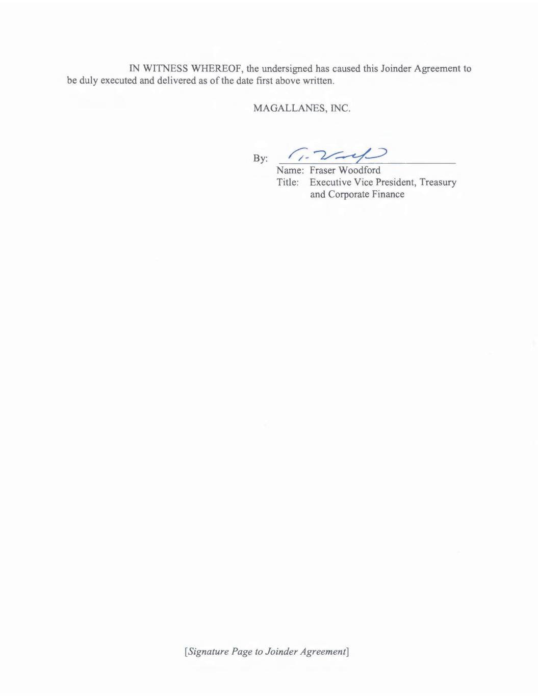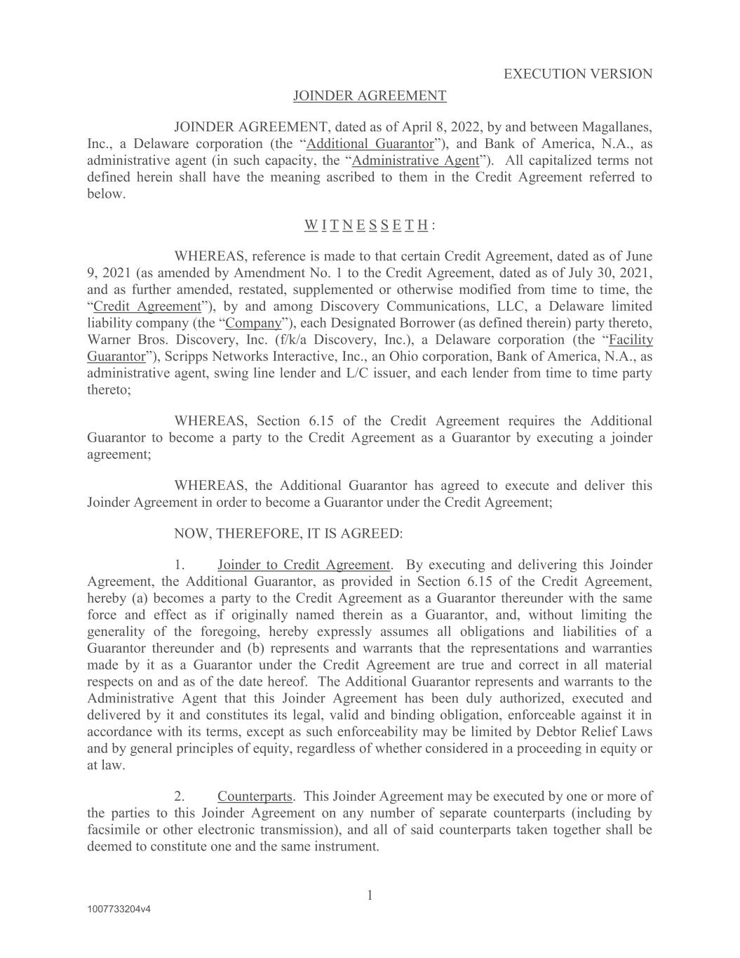 EXECUTION VERSION 1 1007733204v4 JOINDER AGREEMENT JOINDER AGREEMENT, dated as of April 8, 2022, by and between Magallanes, Inc., a Delaware corporation Additional Guarantor , and Bank of America, N.A., as administrative a Administrative Agent pitalized terms not defined herein shall have the meaning ascribed to them in the Credit Agreement referred to below. W I T N E S S E T H : WHEREAS, reference is made to that certain Credit Agreement, dated as of June 9, 2021 (as amended by Amendment No. 1 to the Credit Agreement, dated as of July 30, 2021, and as further amended, restated, supplemented or otherwise modified from time to time, the Credit Agreement by and among Discovery Communications, LLC, a Delaware limited liability company Company each Designated Borrower (as defined therein) party thereto, Warner Bros. Discovery, Inc. (f/k/a Discovery, Inc.), a Delaware corporation Facility Guarantor , Scripps Networks Interactive, Inc., an Ohio corporation, Bank of America, N.A., as administrative agent, swing line lender and L/C issuer, and each lender from time to time party thereto; WHEREAS, Section 6.15 of the Credit Agreement requires the Additional Guarantor to become a party to the Credit Agreement as a Guarantor by executing a joinder agreement; WHEREAS, the Additional Guarantor has agreed to execute and deliver this Joinder Agreement in order to become a Guarantor under the Credit Agreement; NOW, THEREFORE, IT IS AGREED: 1. Joinder to Credit Agreement. By executing and delivering this Joinder Agreement, the Additional Guarantor, as provided in Section 6.15 of the Credit Agreement, hereby (a) becomes a party to the Credit Agreement as a Guarantor thereunder with the same force and effect as if originally named therein as a Guarantor, and, without limiting the generality of the foregoing, hereby expressly assumes all obligations and liabilities of a Guarantor thereunder and (b) represents and warrants that the representations and warranties made by it as a Guarantor under the Credit Agreement are true and correct in all material respects on and as of the date hereof. The Additional Guarantor represents and warrants to the Administrative Agent that this Joinder Agreement has been duly authorized, executed and delivered by it and constitutes its legal, valid and binding obligation, enforceable against it in accordance with its terms, except as such enforceability may be limited by Debtor Relief Laws and by general principles of equity, regardless of whether considered in a proceeding in equity or at law. 2. Counterparts. This Joinder Agreement may be executed by one or more of the parties to this Joinder Agreement on any number of separate counterparts (including by facsimile or other electronic transmission), and all of said counterparts taken together shall be deemed to constitute one and the same instrument.