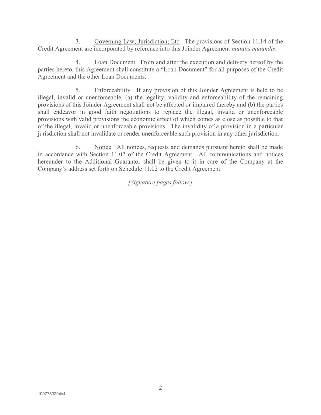 2 1007733204v4 3. Governing Law; Jurisdiction; Etc. The provisions of Section 11.14 of the Credit Agreement are incorporated by reference into this Joinder Agreement mutatis mutandis. 4. Loan Document. From and after the execution and delivery hereof by the Agreement and the other Loan Documents. 5. Enforceability. If any provision of this Joinder Agreement is held to be illegal, invalid or unenforceable, (a) the legality, validity and enforceability of the remaining provisions of this Joinder Agreement shall not be affected or impaired thereby and (b) the parties shall endeavor in good faith negotiations to replace the illegal, invalid or unenforceable provisions with valid provisions the economic effect of which comes as close as possible to that of the illegal, invalid or unenforceable provisions. The invalidity of a provision in a particular jurisdiction shall not invalidate or render unenforceable such provision in any other jurisdiction. 6. Notice. All notices, requests and demands pursuant hereto shall be made in accordance with Section 11.02 of the Credit Agreement. All communications and notices hereunder to the Additional Guarantor shall be given to it in care of the Company at the address set forth on Schedule 11.02 to the Credit Agreement. [Signature pages follow.]
