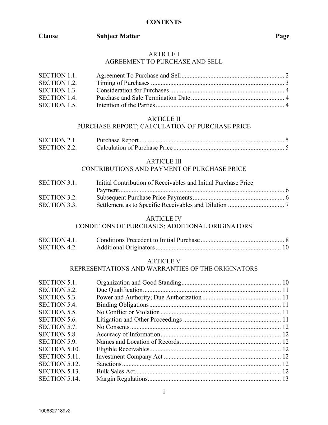 CONTENTS Clause Subject Matter Page i 1008327189v2 ARTICLE I AGREEMENT TO PURCHASE AND SELL SECTION 1.1. Agreement To Purchase and Sell ................................................................ 2 SECTION 1.2. Timing of Purchases ................................................................................... 3 SECTION 1.3. Consideration for Purchases ....................................................................... 4 SECTION 1.4. Purchase and Sale Termination Date .......................................................... 4 SECTION 1.5. Intention of the Parties ................................................................................ 4 ARTICLE II PURCHASE REPORT; CALCULATION OF PURCHASE PRICE SECTION 2.1. Purchase Report .......................................................................................... 5 SECTION 2.2. Calculation of Purchase Price ..................................................................... 5 ARTICLE III CONTRIBUTIONS AND PAYMENT OF PURCHASE PRICE SECTION 3.1. Initial Contribution of Receivables and Initial Purchase Price Payment....................................................................................................... 6 SECTION 3.2. Subsequent Purchase Price Payments ......................................................... 6 SECTION 3.3. Settlement as to Specific Receivables and Dilution ................................... 7 ARTICLE IV CONDITIONS OF PURCHASES; ADDITIONAL ORIGINATORS SECTION 4.1. Conditions Precedent to Initial Purchase .................................................... 8 SECTION 4.2. Additional Originators .............................................................................. 10 ARTICLE V REPRESENTATIONS AND WARRANTIES OF THE ORIGINATORS SECTION 5.1. Organization and Good Standing .............................................................. 10 SECTION 5.2. Due Qualification ...................................................................................... 11 SECTION 5.3. Power and Authority; Due Authorization ................................................. 11 SECTION 5.4. Binding Obligations .................................................................................. 11 SECTION 5.5. No Conflict or Violation ........................................................................... 11 SECTION 5.6. Litigation and Other Proceedings ............................................................. 11 SECTION 5.7. No Consents .............................................................................................. 12 SECTION 5.8. Accuracy of Information ........................................................................... 12 SECTION 5.9. Names and Location of Records ............................................................... 12 SECTION 5.10. Eligible Receivables.................................................................................. 12 SECTION 5.11. Investment Company Act ......................................................................... 12 SECTION 5.12. Sanctions ................................................................................................... 12 SECTION 5.13. Bulk Sales Act........................................................................................... 12 SECTION 5.14. Margin Regulations ................................................................................... 13