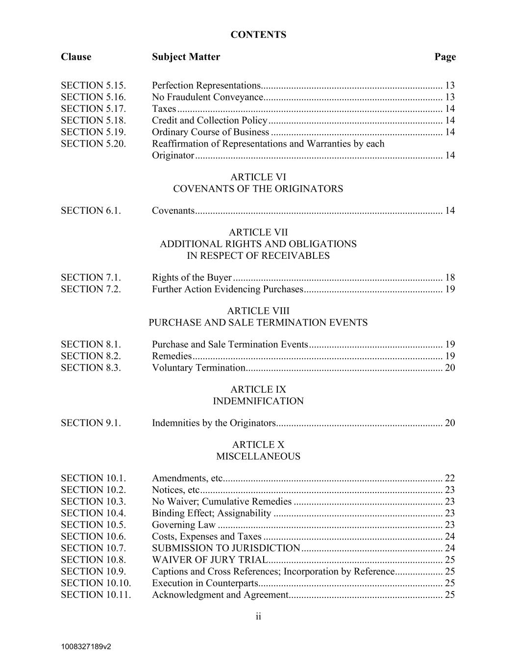 CONTENTS Clause Subject Matter Page ii 1008327189v2 SECTION 5.15. Perfection Representations........................................................................ 13 SECTION 5.16. No Fraudulent Conveyance....................................................................... 13 SECTION 5.17. Taxes ......................................................................................................... 14 SECTION 5.18. Credit and Collection Policy ..................................................................... 14 SECTION 5.19. Ordinary Course of Business .................................................................... 14 SECTION 5.20. Reaffirmation of Representations and Warranties by each Originator .................................................................................................. 14 ARTICLE VI COVENANTS OF THE ORIGINATORS SECTION 6.1. Covenants .................................................................................................. 14 ARTICLE VII ADDITIONAL RIGHTS AND OBLIGATIONS IN RESPECT OF RECEIVABLES SECTION 7.1. Rights of the Buyer ................................................................................... 18 SECTION 7.2. Further Action Evidencing Purchases ....................................................... 19 ARTICLE VIII PURCHASE AND SALE TERMINATION EVENTS SECTION 8.1. Purchase and Sale Termination Events ..................................................... 19 SECTION 8.2. Remedies ................................................................................................... 19 SECTION 8.3. Voluntary Termination.............................................................................. 20 ARTICLE IX INDEMNIFICATION SECTION 9.1. Indemnities by the Originators .................................................................. 20 ARTICLE X MISCELLANEOUS SECTION 10.1. Amendments, etc....................................................................................... 22 SECTION 10.2. Notices, etc ................................................................................................ 23 SECTION 10.3. No Waiver; Cumulative Remedies ........................................................... 23 SECTION 10.4. Binding Effect; Assignability ................................................................... 23 SECTION 10.5. Governing Law ......................................................................................... 23 SECTION 10.6. Costs, Expenses and Taxes ....................................................................... 24 SECTION 10.7. SUBMISSION TO JURISDICTION ........................................................ 24 SECTION 10.8. WAIVER OF JURY TRIAL ..................................................................... 25 SECTION 10.9. Captions and Cross References; Incorporation by Reference ................... 25 SECTION 10.10. Execution in Counterparts......................................................................... 25 SECTION 10.11. Acknowledgment and Agreement............................................................. 25