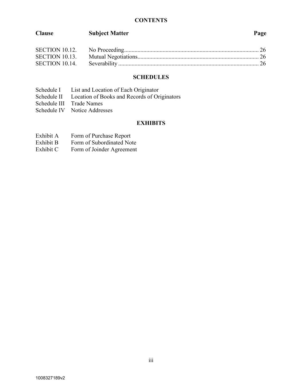 CONTENTS Clause Subject Matter Page iii 1008327189v2 SECTION 10.12. No Proceeding ........................................................................................... 26 SECTION 10.13. Mutual Negotiations.................................................................................. 26 SECTION 10.14. Severability ............................................................................................... 26 SCHEDULES Schedule I List and Location of Each Originator Schedule II Location of Books and Records of Originators Schedule III Trade Names Schedule IV Notice Addresses EXHIBITS Exhibit A Form of Purchase Report Exhibit B Form of Subordinated Note Exhibit C Form of Joinder Agreement