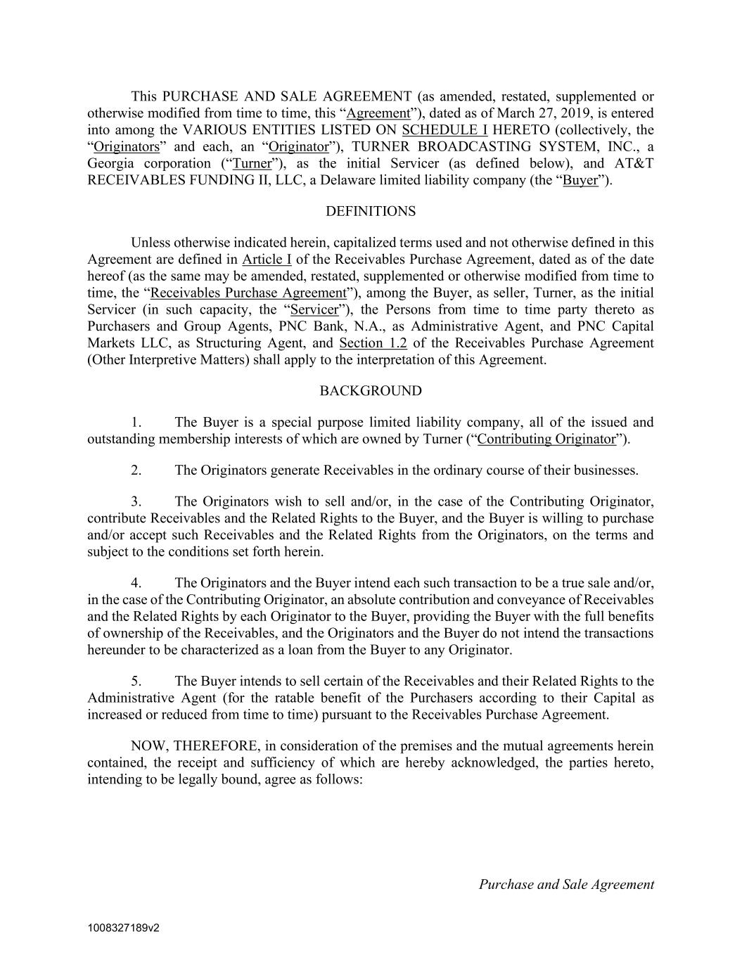 Purchase and Sale Agreement 1008327189v2 This PURCHASE AND SALE AGREEMENT (as amended, restated, supplemented or otherwise modified from time to time, this “Agreement”), dated as of March 27, 2019, is entered into among the VARIOUS ENTITIES LISTED ON SCHEDULE I HERETO (collectively, the “Originators” and each, an “Originator”), TURNER BROADCASTING SYSTEM, INC., a Georgia corporation (“Turner”), as the initial Servicer (as defined below), and AT&T RECEIVABLES FUNDING II, LLC, a Delaware limited liability company (the “Buyer”). DEFINITIONS Unless otherwise indicated herein, capitalized terms used and not otherwise defined in this Agreement are defined in Article I of the Receivables Purchase Agreement, dated as of the date hereof (as the same may be amended, restated, supplemented or otherwise modified from time to time, the “Receivables Purchase Agreement”), among the Buyer, as seller, Turner, as the initial Servicer (in such capacity, the “Servicer”), the Persons from time to time party thereto as Purchasers and Group Agents, PNC Bank, N.A., as Administrative Agent, and PNC Capital Markets LLC, as Structuring Agent, and Section 1.2 of the Receivables Purchase Agreement (Other Interpretive Matters) shall apply to the interpretation of this Agreement. BACKGROUND 1. The Buyer is a special purpose limited liability company, all of the issued and outstanding membership interests of which are owned by Turner (“Contributing Originator”). 2. The Originators generate Receivables in the ordinary course of their businesses. 3. The Originators wish to sell and/or, in the case of the Contributing Originator, contribute Receivables and the Related Rights to the Buyer, and the Buyer is willing to purchase and/or accept such Receivables and the Related Rights from the Originators, on the terms and subject to the conditions set forth herein. 4. The Originators and the Buyer intend each such transaction to be a true sale and/or, in the case of the Contributing Originator, an absolute contribution and conveyance of Receivables and the Related Rights by each Originator to the Buyer, providing the Buyer with the full benefits of ownership of the Receivables, and the Originators and the Buyer do not intend the transactions hereunder to be characterized as a loan from the Buyer to any Originator. 5. The Buyer intends to sell certain of the Receivables and their Related Rights to the Administrative Agent (for the ratable benefit of the Purchasers according to their Capital as increased or reduced from time to time) pursuant to the Receivables Purchase Agreement. NOW, THEREFORE, in consideration of the premises and the mutual agreements herein contained, the receipt and sufficiency of which are hereby acknowledged, the parties hereto, intending to be legally bound, agree as follows: