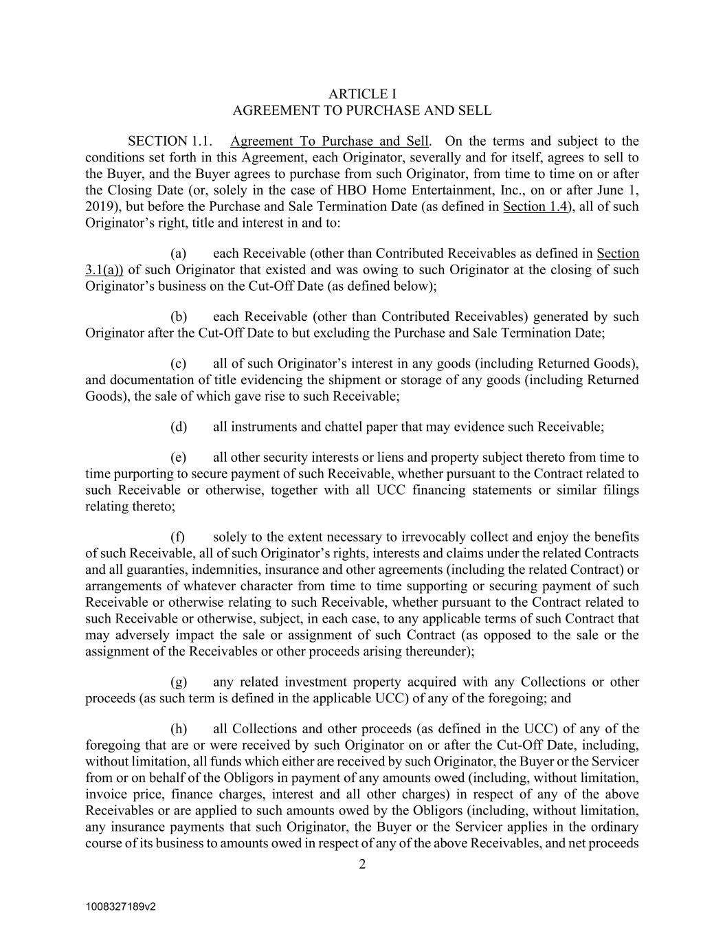 2 1008327189v2 ARTICLE I AGREEMENT TO PURCHASE AND SELL SECTION 1.1. Agreement To Purchase and Sell. On the terms and subject to the conditions set forth in this Agreement, each Originator, severally and for itself, agrees to sell to the Buyer, and the Buyer agrees to purchase from such Originator, from time to time on or after the Closing Date (or, solely in the case of HBO Home Entertainment, Inc., on or after June 1, 2019), but before the Purchase and Sale Termination Date (as defined in Section 1.4), all of such Originator’s right, title and interest in and to: (a) each Receivable (other than Contributed Receivables as defined in Section 3.1(a)) of such Originator that existed and was owing to such Originator at the closing of such Originator’s business on the Cut-Off Date (as defined below); (b) each Receivable (other than Contributed Receivables) generated by such Originator after the Cut-Off Date to but excluding the Purchase and Sale Termination Date; (c) all of such Originator’s interest in any goods (including Returned Goods), and documentation of title evidencing the shipment or storage of any goods (including Returned Goods), the sale of which gave rise to such Receivable; (d) all instruments and chattel paper that may evidence such Receivable; (e) all other security interests or liens and property subject thereto from time to time purporting to secure payment of such Receivable, whether pursuant to the Contract related to such Receivable or otherwise, together with all UCC financing statements or similar filings relating thereto; (f) solely to the extent necessary to irrevocably collect and enjoy the benefits of such Receivable, all of such Originator’s rights, interests and claims under the related Contracts and all guaranties, indemnities, insurance and other agreements (including the related Contract) or arrangements of whatever character from time to time supporting or securing payment of such Receivable or otherwise relating to such Receivable, whether pursuant to the Contract related to such Receivable or otherwise, subject, in each case, to any applicable terms of such Contract that may adversely impact the sale or assignment of such Contract (as opposed to the sale or the assignment of the Receivables or other proceeds arising thereunder); (g) any related investment property acquired with any Collections or other proceeds (as such term is defined in the applicable UCC) of any of the foregoing; and (h) all Collections and other proceeds (as defined in the UCC) of any of the foregoing that are or were received by such Originator on or after the Cut-Off Date, including, without limitation, all funds which either are received by such Originator, the Buyer or the Servicer from or on behalf of the Obligors in payment of any amounts owed (including, without limitation, invoice price, finance charges, interest and all other charges) in respect of any of the above Receivables or are applied to such amounts owed by the Obligors (including, without limitation, any insurance payments that such Originator, the Buyer or the Servicer applies in the ordinary course of its business to amounts owed in respect of any of the above Receivables, and net proceeds