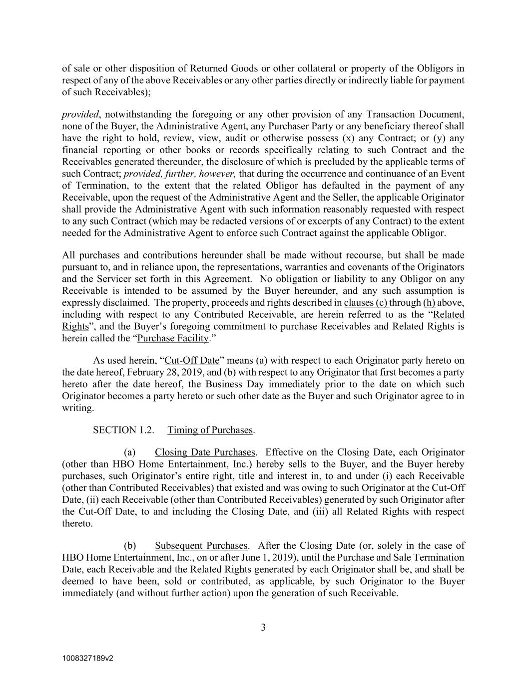 3 1008327189v2 of sale or other disposition of Returned Goods or other collateral or property of the Obligors in respect of any of the above Receivables or any other parties directly or indirectly liable for payment of such Receivables); provided, notwithstanding the foregoing or any other provision of any Transaction Document, none of the Buyer, the Administrative Agent, any Purchaser Party or any beneficiary thereof shall have the right to hold, review, view, audit or otherwise possess (x) any Contract; or (y) any financial reporting or other books or records specifically relating to such Contract and the Receivables generated thereunder, the disclosure of which is precluded by the applicable terms of such Contract; provided, further, however, that during the occurrence and continuance of an Event of Termination, to the extent that the related Obligor has defaulted in the payment of any Receivable, upon the request of the Administrative Agent and the Seller, the applicable Originator shall provide the Administrative Agent with such information reasonably requested with respect to any such Contract (which may be redacted versions of or excerpts of any Contract) to the extent needed for the Administrative Agent to enforce such Contract against the applicable Obligor. All purchases and contributions hereunder shall be made without recourse, but shall be made pursuant to, and in reliance upon, the representations, warranties and covenants of the Originators and the Servicer set forth in this Agreement. No obligation or liability to any Obligor on any Receivable is intended to be assumed by the Buyer hereunder, and any such assumption is expressly disclaimed. The property, proceeds and rights described in clauses (c) through (h) above, including with respect to any Contributed Receivable, are herein referred to as the “Related Rights”, and the Buyer’s foregoing commitment to purchase Receivables and Related Rights is herein called the “Purchase Facility.” As used herein, “Cut-Off Date” means (a) with respect to each Originator party hereto on the date hereof, February 28, 2019, and (b) with respect to any Originator that first becomes a party hereto after the date hereof, the Business Day immediately prior to the date on which such Originator becomes a party hereto or such other date as the Buyer and such Originator agree to in writing. SECTION 1.2. Timing of Purchases. (a) Closing Date Purchases. Effective on the Closing Date, each Originator (other than HBO Home Entertainment, Inc.) hereby sells to the Buyer, and the Buyer hereby purchases, such Originator’s entire right, title and interest in, to and under (i) each Receivable (other than Contributed Receivables) that existed and was owing to such Originator at the Cut-Off Date, (ii) each Receivable (other than Contributed Receivables) generated by such Originator after the Cut-Off Date, to and including the Closing Date, and (iii) all Related Rights with respect thereto. (b) Subsequent Purchases. After the Closing Date (or, solely in the case of HBO Home Entertainment, Inc., on or after June 1, 2019), until the Purchase and Sale Termination Date, each Receivable and the Related Rights generated by each Originator shall be, and shall be deemed to have been, sold or contributed, as applicable, by such Originator to the Buyer immediately (and without further action) upon the generation of such Receivable.
