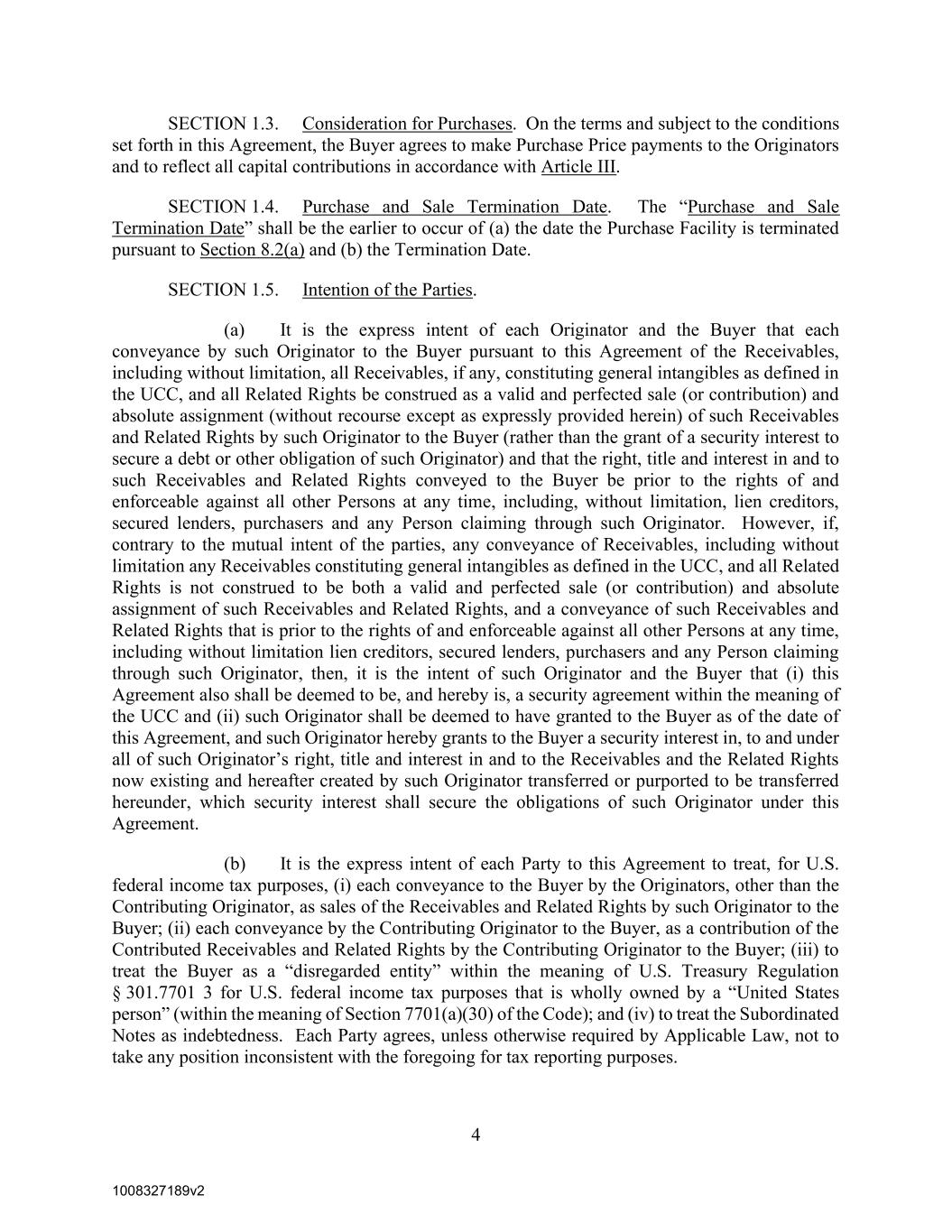 4 1008327189v2 SECTION 1.3. Consideration for Purchases. On the terms and subject to the conditions set forth in this Agreement, the Buyer agrees to make Purchase Price payments to the Originators and to reflect all capital contributions in accordance with Article III. SECTION 1.4. Purchase and Sale Termination Date. The “Purchase and Sale Termination Date” shall be the earlier to occur of (a) the date the Purchase Facility is terminated pursuant to Section 8.2(a) and (b) the Termination Date. SECTION 1.5. Intention of the Parties. (a) It is the express intent of each Originator and the Buyer that each conveyance by such Originator to the Buyer pursuant to this Agreement of the Receivables, including without limitation, all Receivables, if any, constituting general intangibles as defined in the UCC, and all Related Rights be construed as a valid and perfected sale (or contribution) and absolute assignment (without recourse except as expressly provided herein) of such Receivables and Related Rights by such Originator to the Buyer (rather than the grant of a security interest to secure a debt or other obligation of such Originator) and that the right, title and interest in and to such Receivables and Related Rights conveyed to the Buyer be prior to the rights of and enforceable against all other Persons at any time, including, without limitation, lien creditors, secured lenders, purchasers and any Person claiming through such Originator. However, if, contrary to the mutual intent of the parties, any conveyance of Receivables, including without limitation any Receivables constituting general intangibles as defined in the UCC, and all Related Rights is not construed to be both a valid and perfected sale (or contribution) and absolute assignment of such Receivables and Related Rights, and a conveyance of such Receivables and Related Rights that is prior to the rights of and enforceable against all other Persons at any time, including without limitation lien creditors, secured lenders, purchasers and any Person claiming through such Originator, then, it is the intent of such Originator and the Buyer that (i) this Agreement also shall be deemed to be, and hereby is, a security agreement within the meaning of the UCC and (ii) such Originator shall be deemed to have granted to the Buyer as of the date of this Agreement, and such Originator hereby grants to the Buyer a security interest in, to and under all of such Originator’s right, title and interest in and to the Receivables and the Related Rights now existing and hereafter created by such Originator transferred or purported to be transferred hereunder, which security interest shall secure the obligations of such Originator under this Agreement. (b) It is the express intent of each Party to this Agreement to treat, for U.S. federal income tax purposes, (i) each conveyance to the Buyer by the Originators, other than the Contributing Originator, as sales of the Receivables and Related Rights by such Originator to the Buyer; (ii) each conveyance by the Contributing Originator to the Buyer, as a contribution of the Contributed Receivables and Related Rights by the Contributing Originator to the Buyer; (iii) to treat the Buyer as a “disregarded entity” within the meaning of U.S. Treasury Regulation § 301.7701 3 for U.S. federal income tax purposes that is wholly owned by a “United States person” (within the meaning of Section 7701(a)(30) of the Code); and (iv) to treat the Subordinated Notes as indebtedness. Each Party agrees, unless otherwise required by Applicable Law, not to take any position inconsistent with the foregoing for tax reporting purposes.
