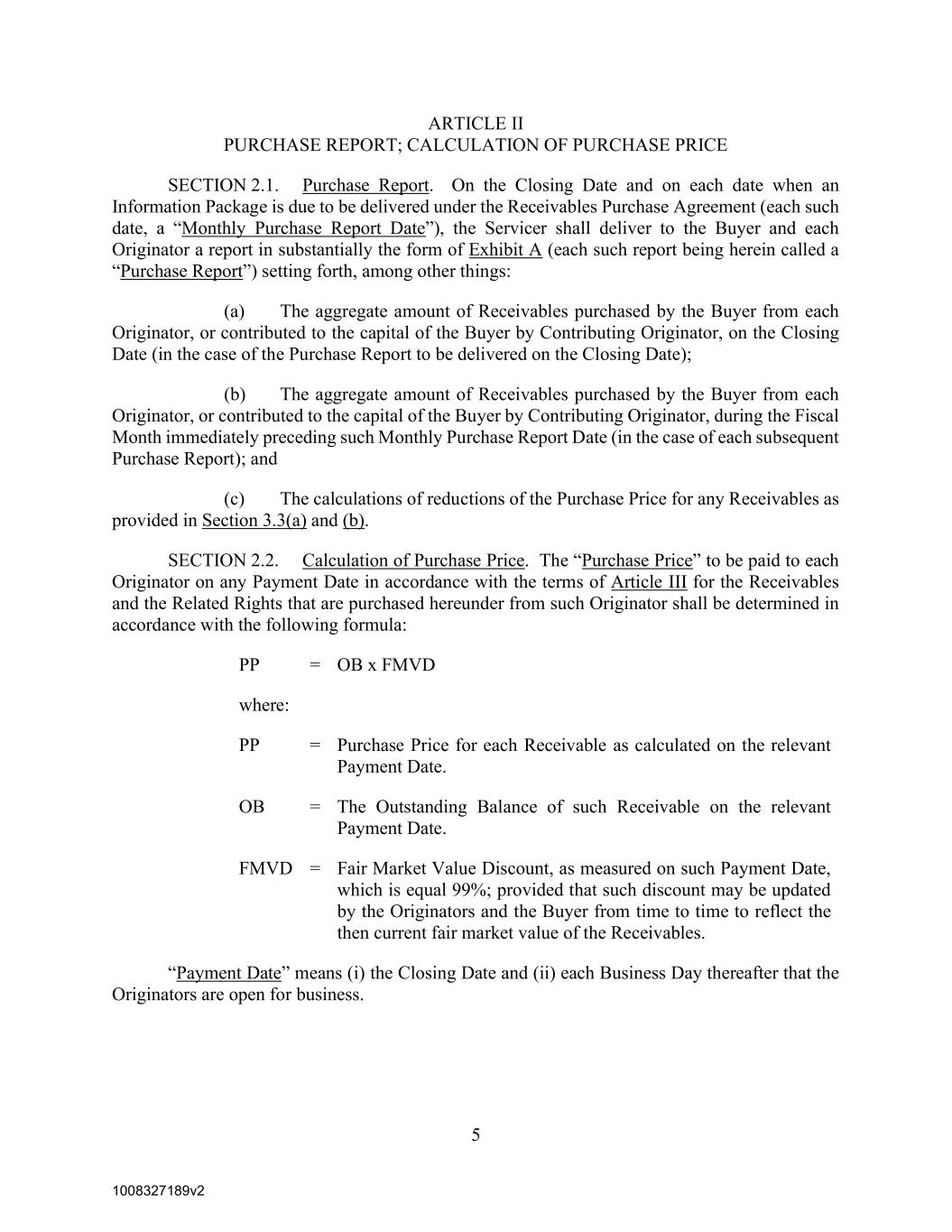 5 1008327189v2 ARTICLE II PURCHASE REPORT; CALCULATION OF PURCHASE PRICE SECTION 2.1. Purchase Report. On the Closing Date and on each date when an Information Package is due to be delivered under the Receivables Purchase Agreement (each such date, a “Monthly Purchase Report Date”), the Servicer shall deliver to the Buyer and each Originator a report in substantially the form of Exhibit A (each such report being herein called a “Purchase Report”) setting forth, among other things: (a) The aggregate amount of Receivables purchased by the Buyer from each Originator, or contributed to the capital of the Buyer by Contributing Originator, on the Closing Date (in the case of the Purchase Report to be delivered on the Closing Date); (b) The aggregate amount of Receivables purchased by the Buyer from each Originator, or contributed to the capital of the Buyer by Contributing Originator, during the Fiscal Month immediately preceding such Monthly Purchase Report Date (in the case of each subsequent Purchase Report); and (c) The calculations of reductions of the Purchase Price for any Receivables as provided in Section 3.3(a) and (b). SECTION 2.2. Calculation of Purchase Price. The “Purchase Price” to be paid to each Originator on any Payment Date in accordance with the terms of Article III for the Receivables and the Related Rights that are purchased hereunder from such Originator shall be determined in accordance with the following formula: PP = OB x FMVD where: PP = Purchase Price for each Receivable as calculated on the relevant Payment Date. OB = The Outstanding Balance of such Receivable on the relevant Payment Date. FMVD = Fair Market Value Discount, as measured on such Payment Date, which is equal 99%; provided that such discount may be updated by the Originators and the Buyer from time to time to reflect the then current fair market value of the Receivables. “Payment Date” means (i) the Closing Date and (ii) each Business Day thereafter that the Originators are open for business.