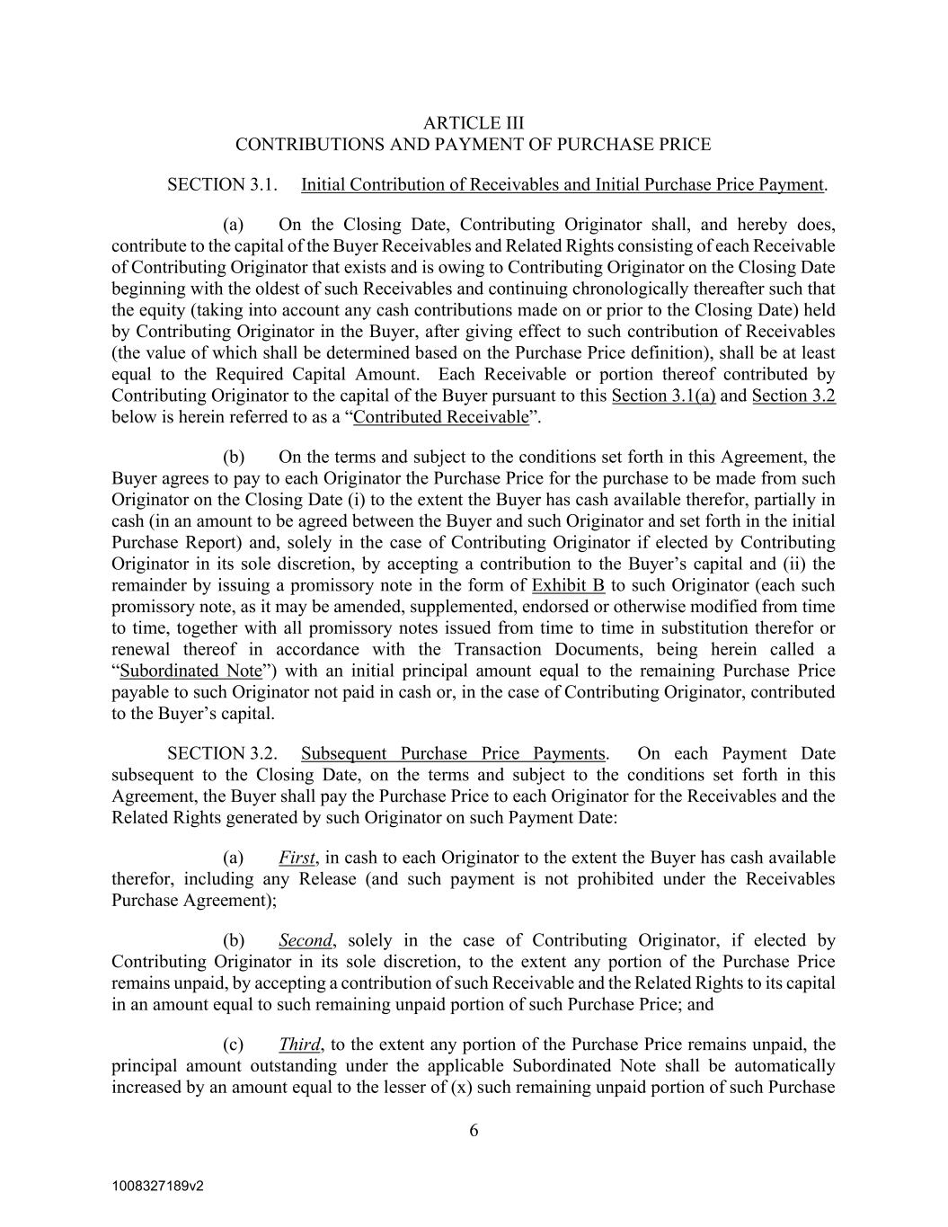 6 1008327189v2 ARTICLE III CONTRIBUTIONS AND PAYMENT OF PURCHASE PRICE SECTION 3.1. Initial Contribution of Receivables and Initial Purchase Price Payment. (a) On the Closing Date, Contributing Originator shall, and hereby does, contribute to the capital of the Buyer Receivables and Related Rights consisting of each Receivable of Contributing Originator that exists and is owing to Contributing Originator on the Closing Date beginning with the oldest of such Receivables and continuing chronologically thereafter such that the equity (taking into account any cash contributions made on or prior to the Closing Date) held by Contributing Originator in the Buyer, after giving effect to such contribution of Receivables (the value of which shall be determined based on the Purchase Price definition), shall be at least equal to the Required Capital Amount. Each Receivable or portion thereof contributed by Contributing Originator to the capital of the Buyer pursuant to this Section 3.1(a) and Section 3.2 below is herein referred to as a “Contributed Receivable”. (b) On the terms and subject to the conditions set forth in this Agreement, the Buyer agrees to pay to each Originator the Purchase Price for the purchase to be made from such Originator on the Closing Date (i) to the extent the Buyer has cash available therefor, partially in cash (in an amount to be agreed between the Buyer and such Originator and set forth in the initial Purchase Report) and, solely in the case of Contributing Originator if elected by Contributing Originator in its sole discretion, by accepting a contribution to the Buyer’s capital and (ii) the remainder by issuing a promissory note in the form of Exhibit B to such Originator (each such promissory note, as it may be amended, supplemented, endorsed or otherwise modified from time to time, together with all promissory notes issued from time to time in substitution therefor or renewal thereof in accordance with the Transaction Documents, being herein called a “Subordinated Note”) with an initial principal amount equal to the remaining Purchase Price payable to such Originator not paid in cash or, in the case of Contributing Originator, contributed to the Buyer’s capital. SECTION 3.2. Subsequent Purchase Price Payments. On each Payment Date subsequent to the Closing Date, on the terms and subject to the conditions set forth in this Agreement, the Buyer shall pay the Purchase Price to each Originator for the Receivables and the Related Rights generated by such Originator on such Payment Date: (a) First, in cash to each Originator to the extent the Buyer has cash available therefor, including any Release (and such payment is not prohibited under the Receivables Purchase Agreement); (b) Second, solely in the case of Contributing Originator, if elected by Contributing Originator in its sole discretion, to the extent any portion of the Purchase Price remains unpaid, by accepting a contribution of such Receivable and the Related Rights to its capital in an amount equal to such remaining unpaid portion of such Purchase Price; and (c) Third, to the extent any portion of the Purchase Price remains unpaid, the principal amount outstanding under the applicable Subordinated Note shall be automatically increased by an amount equal to the lesser of (x) such remaining unpaid portion of such Purchase