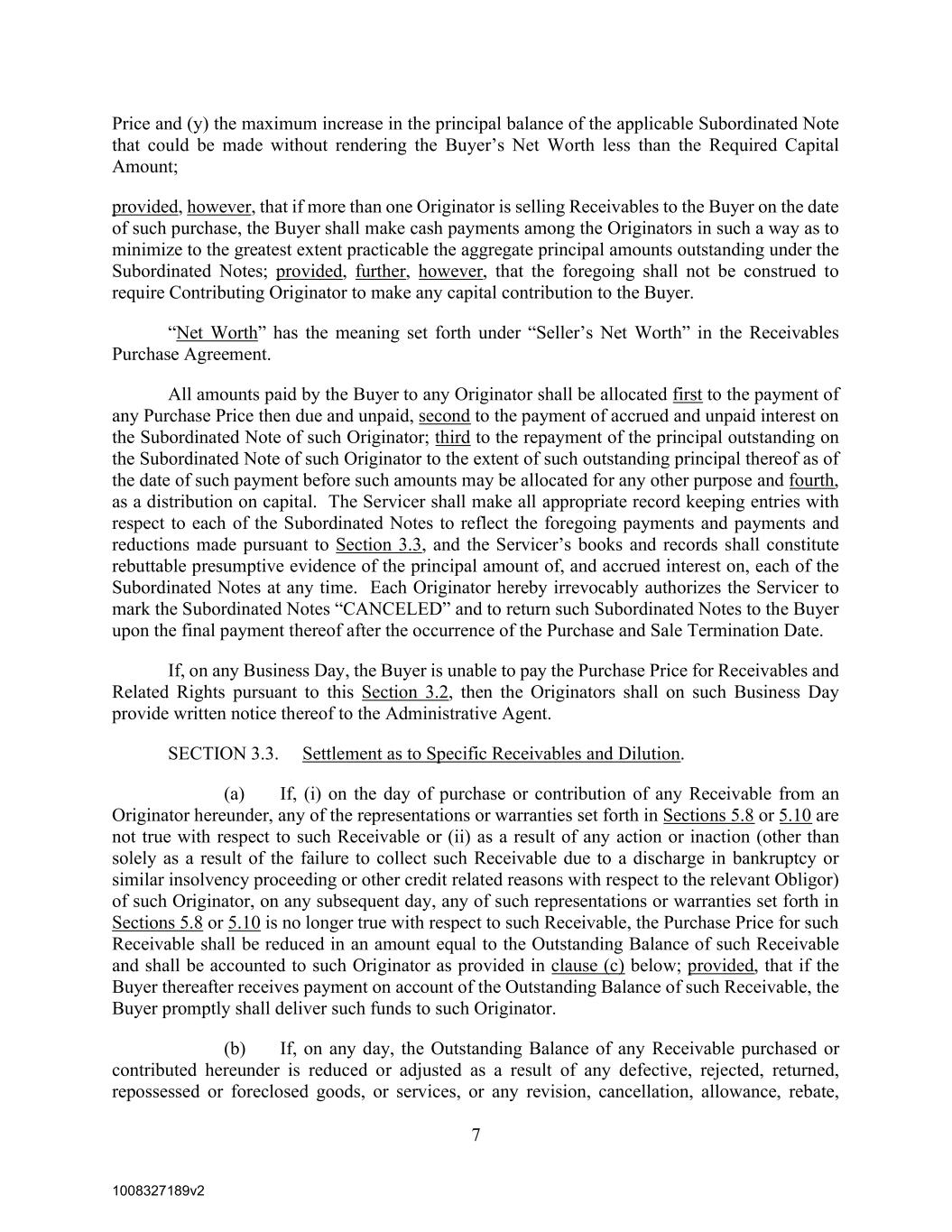 7 1008327189v2 Price and (y) the maximum increase in the principal balance of the applicable Subordinated Note that could be made without rendering the Buyer’s Net Worth less than the Required Capital Amount; provided, however, that if more than one Originator is selling Receivables to the Buyer on the date of such purchase, the Buyer shall make cash payments among the Originators in such a way as to minimize to the greatest extent practicable the aggregate principal amounts outstanding under the Subordinated Notes; provided, further, however, that the foregoing shall not be construed to require Contributing Originator to make any capital contribution to the Buyer. “Net Worth” has the meaning set forth under “Seller’s Net Worth” in the Receivables Purchase Agreement. All amounts paid by the Buyer to any Originator shall be allocated first to the payment of any Purchase Price then due and unpaid, second to the payment of accrued and unpaid interest on the Subordinated Note of such Originator; third to the repayment of the principal outstanding on the Subordinated Note of such Originator to the extent of such outstanding principal thereof as of the date of such payment before such amounts may be allocated for any other purpose and fourth, as a distribution on capital. The Servicer shall make all appropriate record keeping entries with respect to each of the Subordinated Notes to reflect the foregoing payments and payments and reductions made pursuant to Section 3.3, and the Servicer’s books and records shall constitute rebuttable presumptive evidence of the principal amount of, and accrued interest on, each of the Subordinated Notes at any time. Each Originator hereby irrevocably authorizes the Servicer to mark the Subordinated Notes “CANCELED” and to return such Subordinated Notes to the Buyer upon the final payment thereof after the occurrence of the Purchase and Sale Termination Date. If, on any Business Day, the Buyer is unable to pay the Purchase Price for Receivables and Related Rights pursuant to this Section 3.2, then the Originators shall on such Business Day provide written notice thereof to the Administrative Agent. SECTION 3.3. Settlement as to Specific Receivables and Dilution. (a) If, (i) on the day of purchase or contribution of any Receivable from an Originator hereunder, any of the representations or warranties set forth in Sections 5.8 or 5.10 are not true with respect to such Receivable or (ii) as a result of any action or inaction (other than solely as a result of the failure to collect such Receivable due to a discharge in bankruptcy or similar insolvency proceeding or other credit related reasons with respect to the relevant Obligor) of such Originator, on any subsequent day, any of such representations or warranties set forth in Sections 5.8 or 5.10 is no longer true with respect to such Receivable, the Purchase Price for such Receivable shall be reduced in an amount equal to the Outstanding Balance of such Receivable and shall be accounted to such Originator as provided in clause (c) below; provided, that if the Buyer thereafter receives payment on account of the Outstanding Balance of such Receivable, the Buyer promptly shall deliver such funds to such Originator. (b) If, on any day, the Outstanding Balance of any Receivable purchased or contributed hereunder is reduced or adjusted as a result of any defective, rejected, returned, repossessed or foreclosed goods, or services, or any revision, cancellation, allowance, rebate,