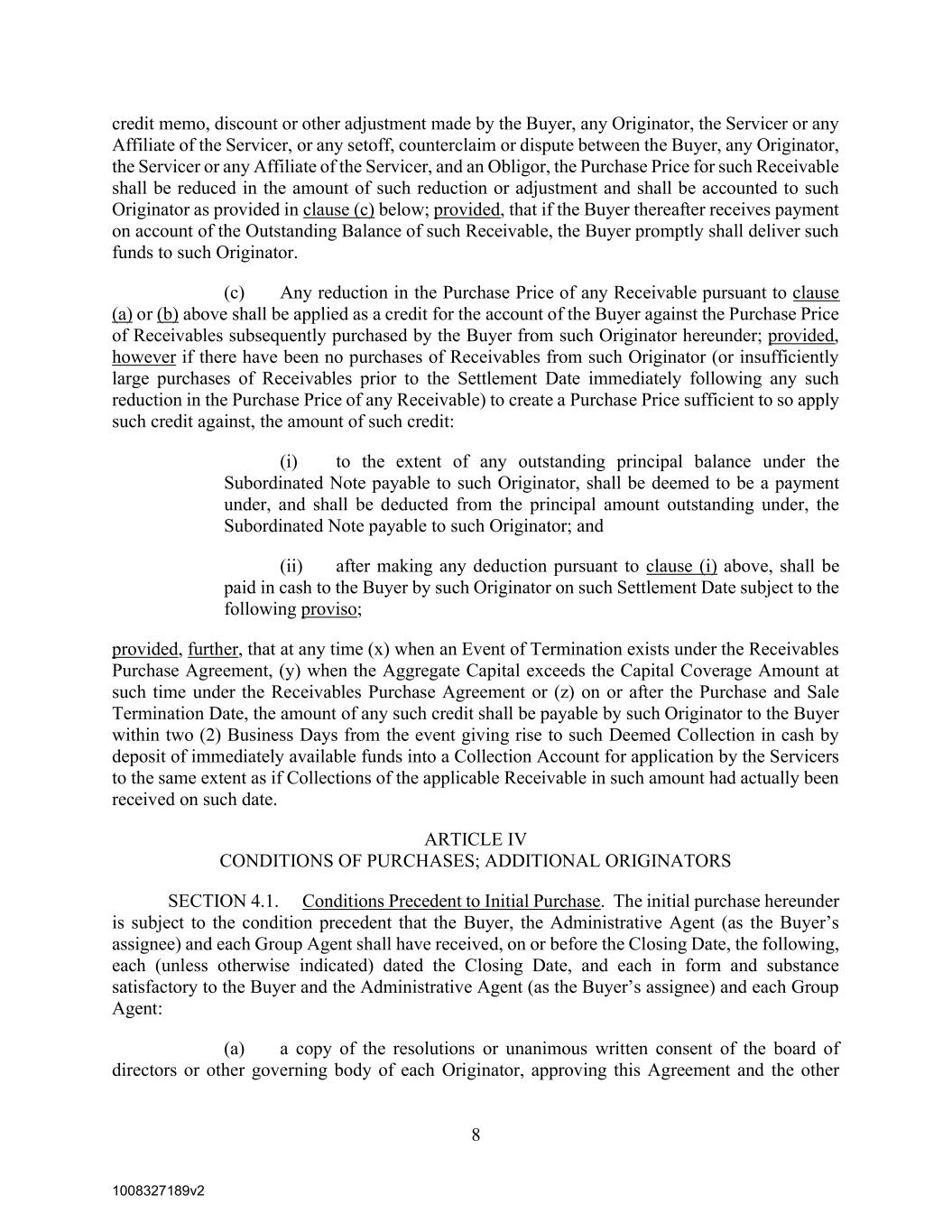 8 1008327189v2 credit memo, discount or other adjustment made by the Buyer, any Originator, the Servicer or any Affiliate of the Servicer, or any setoff, counterclaim or dispute between the Buyer, any Originator, the Servicer or any Affiliate of the Servicer, and an Obligor, the Purchase Price for such Receivable shall be reduced in the amount of such reduction or adjustment and shall be accounted to such Originator as provided in clause (c) below; provided, that if the Buyer thereafter receives payment on account of the Outstanding Balance of such Receivable, the Buyer promptly shall deliver such funds to such Originator. (c) Any reduction in the Purchase Price of any Receivable pursuant to clause (a) or (b) above shall be applied as a credit for the account of the Buyer against the Purchase Price of Receivables subsequently purchased by the Buyer from such Originator hereunder; provided, however if there have been no purchases of Receivables from such Originator (or insufficiently large purchases of Receivables prior to the Settlement Date immediately following any such reduction in the Purchase Price of any Receivable) to create a Purchase Price sufficient to so apply such credit against, the amount of such credit: (i) to the extent of any outstanding principal balance under the Subordinated Note payable to such Originator, shall be deemed to be a payment under, and shall be deducted from the principal amount outstanding under, the Subordinated Note payable to such Originator; and (ii) after making any deduction pursuant to clause (i) above, shall be paid in cash to the Buyer by such Originator on such Settlement Date subject to the following proviso; provided, further, that at any time (x) when an Event of Termination exists under the Receivables Purchase Agreement, (y) when the Aggregate Capital exceeds the Capital Coverage Amount at such time under the Receivables Purchase Agreement or (z) on or after the Purchase and Sale Termination Date, the amount of any such credit shall be payable by such Originator to the Buyer within two (2) Business Days from the event giving rise to such Deemed Collection in cash by deposit of immediately available funds into a Collection Account for application by the Servicers to the same extent as if Collections of the applicable Receivable in such amount had actually been received on such date. ARTICLE IV CONDITIONS OF PURCHASES; ADDITIONAL ORIGINATORS SECTION 4.1. Conditions Precedent to Initial Purchase. The initial purchase hereunder is subject to the condition precedent that the Buyer, the Administrative Agent (as the Buyer’s assignee) and each Group Agent shall have received, on or before the Closing Date, the following, each (unless otherwise indicated) dated the Closing Date, and each in form and substance satisfactory to the Buyer and the Administrative Agent (as the Buyer’s assignee) and each Group Agent: (a) a copy of the resolutions or unanimous written consent of the board of directors or other governing body of each Originator, approving this Agreement and the other