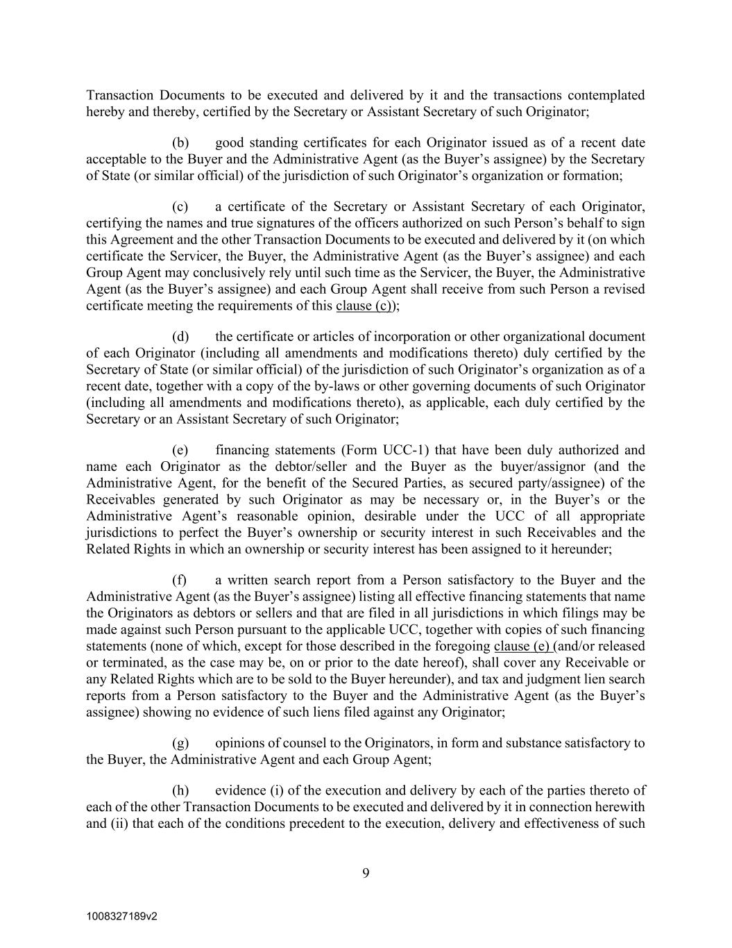 9 1008327189v2 Transaction Documents to be executed and delivered by it and the transactions contemplated hereby and thereby, certified by the Secretary or Assistant Secretary of such Originator; (b) good standing certificates for each Originator issued as of a recent date acceptable to the Buyer and the Administrative Agent (as the Buyer’s assignee) by the Secretary of State (or similar official) of the jurisdiction of such Originator’s organization or formation; (c) a certificate of the Secretary or Assistant Secretary of each Originator, certifying the names and true signatures of the officers authorized on such Person’s behalf to sign this Agreement and the other Transaction Documents to be executed and delivered by it (on which certificate the Servicer, the Buyer, the Administrative Agent (as the Buyer’s assignee) and each Group Agent may conclusively rely until such time as the Servicer, the Buyer, the Administrative Agent (as the Buyer’s assignee) and each Group Agent shall receive from such Person a revised certificate meeting the requirements of this clause (c)); (d) the certificate or articles of incorporation or other organizational document of each Originator (including all amendments and modifications thereto) duly certified by the Secretary of State (or similar official) of the jurisdiction of such Originator’s organization as of a recent date, together with a copy of the by-laws or other governing documents of such Originator (including all amendments and modifications thereto), as applicable, each duly certified by the Secretary or an Assistant Secretary of such Originator; (e) financing statements (Form UCC-1) that have been duly authorized and name each Originator as the debtor/seller and the Buyer as the buyer/assignor (and the Administrative Agent, for the benefit of the Secured Parties, as secured party/assignee) of the Receivables generated by such Originator as may be necessary or, in the Buyer’s or the Administrative Agent’s reasonable opinion, desirable under the UCC of all appropriate jurisdictions to perfect the Buyer’s ownership or security interest in such Receivables and the Related Rights in which an ownership or security interest has been assigned to it hereunder; (f) a written search report from a Person satisfactory to the Buyer and the Administrative Agent (as the Buyer’s assignee) listing all effective financing statements that name the Originators as debtors or sellers and that are filed in all jurisdictions in which filings may be made against such Person pursuant to the applicable UCC, together with copies of such financing statements (none of which, except for those described in the foregoing clause (e) (and/or released or terminated, as the case may be, on or prior to the date hereof), shall cover any Receivable or any Related Rights which are to be sold to the Buyer hereunder), and tax and judgment lien search reports from a Person satisfactory to the Buyer and the Administrative Agent (as the Buyer’s assignee) showing no evidence of such liens filed against any Originator; (g) opinions of counsel to the Originators, in form and substance satisfactory to the Buyer, the Administrative Agent and each Group Agent; (h) evidence (i) of the execution and delivery by each of the parties thereto of each of the other Transaction Documents to be executed and delivered by it in connection herewith and (ii) that each of the conditions precedent to the execution, delivery and effectiveness of such