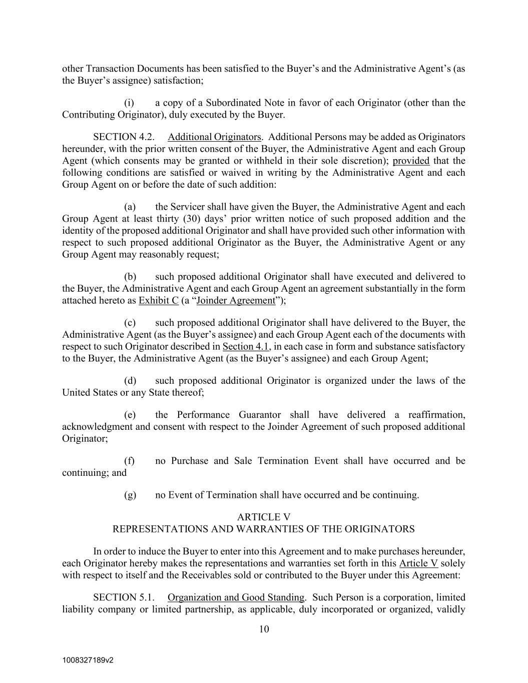 10 1008327189v2 other Transaction Documents has been satisfied to the Buyer’s and the Administrative Agent’s (as the Buyer’s assignee) satisfaction; (i) a copy of a Subordinated Note in favor of each Originator (other than the Contributing Originator), duly executed by the Buyer. SECTION 4.2. Additional Originators. Additional Persons may be added as Originators hereunder, with the prior written consent of the Buyer, the Administrative Agent and each Group Agent (which consents may be granted or withheld in their sole discretion); provided that the following conditions are satisfied or waived in writing by the Administrative Agent and each Group Agent on or before the date of such addition: (a) the Servicer shall have given the Buyer, the Administrative Agent and each Group Agent at least thirty (30) days’ prior written notice of such proposed addition and the identity of the proposed additional Originator and shall have provided such other information with respect to such proposed additional Originator as the Buyer, the Administrative Agent or any Group Agent may reasonably request; (b) such proposed additional Originator shall have executed and delivered to the Buyer, the Administrative Agent and each Group Agent an agreement substantially in the form attached hereto as Exhibit C (a “Joinder Agreement”); (c) such proposed additional Originator shall have delivered to the Buyer, the Administrative Agent (as the Buyer’s assignee) and each Group Agent each of the documents with respect to such Originator described in Section 4.1, in each case in form and substance satisfactory to the Buyer, the Administrative Agent (as the Buyer’s assignee) and each Group Agent; (d) such proposed additional Originator is organized under the laws of the United States or any State thereof; (e) the Performance Guarantor shall have delivered a reaffirmation, acknowledgment and consent with respect to the Joinder Agreement of such proposed additional Originator; (f) no Purchase and Sale Termination Event shall have occurred and be continuing; and (g) no Event of Termination shall have occurred and be continuing. ARTICLE V REPRESENTATIONS AND WARRANTIES OF THE ORIGINATORS In order to induce the Buyer to enter into this Agreement and to make purchases hereunder, each Originator hereby makes the representations and warranties set forth in this Article V solely with respect to itself and the Receivables sold or contributed to the Buyer under this Agreement: SECTION 5.1. Organization and Good Standing. Such Person is a corporation, limited liability company or limited partnership, as applicable, duly incorporated or organized, validly