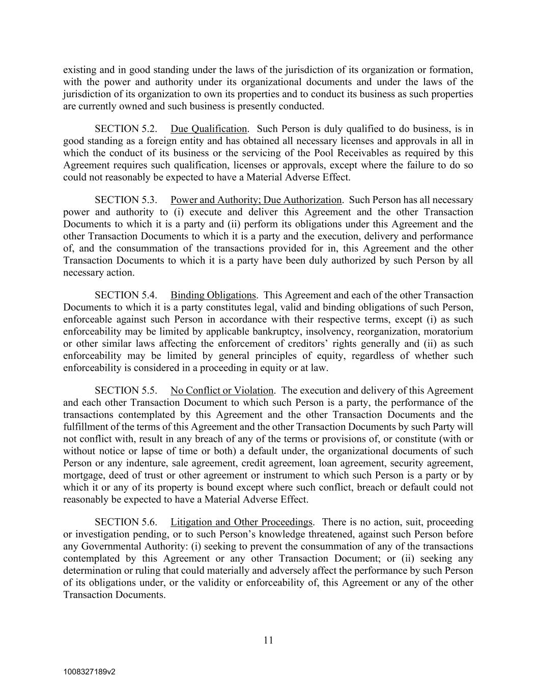 11 1008327189v2 existing and in good standing under the laws of the jurisdiction of its organization or formation, with the power and authority under its organizational documents and under the laws of the jurisdiction of its organization to own its properties and to conduct its business as such properties are currently owned and such business is presently conducted. SECTION 5.2. Due Qualification. Such Person is duly qualified to do business, is in good standing as a foreign entity and has obtained all necessary licenses and approvals in all in which the conduct of its business or the servicing of the Pool Receivables as required by this Agreement requires such qualification, licenses or approvals, except where the failure to do so could not reasonably be expected to have a Material Adverse Effect. SECTION 5.3. Power and Authority; Due Authorization. Such Person has all necessary power and authority to (i) execute and deliver this Agreement and the other Transaction Documents to which it is a party and (ii) perform its obligations under this Agreement and the other Transaction Documents to which it is a party and the execution, delivery and performance of, and the consummation of the transactions provided for in, this Agreement and the other Transaction Documents to which it is a party have been duly authorized by such Person by all necessary action. SECTION 5.4. Binding Obligations. This Agreement and each of the other Transaction Documents to which it is a party constitutes legal, valid and binding obligations of such Person, enforceable against such Person in accordance with their respective terms, except (i) as such enforceability may be limited by applicable bankruptcy, insolvency, reorganization, moratorium or other similar laws affecting the enforcement of creditors’ rights generally and (ii) as such enforceability may be limited by general principles of equity, regardless of whether such enforceability is considered in a proceeding in equity or at law. SECTION 5.5. No Conflict or Violation. The execution and delivery of this Agreement and each other Transaction Document to which such Person is a party, the performance of the transactions contemplated by this Agreement and the other Transaction Documents and the fulfillment of the terms of this Agreement and the other Transaction Documents by such Party will not conflict with, result in any breach of any of the terms or provisions of, or constitute (with or without notice or lapse of time or both) a default under, the organizational documents of such Person or any indenture, sale agreement, credit agreement, loan agreement, security agreement, mortgage, deed of trust or other agreement or instrument to which such Person is a party or by which it or any of its property is bound except where such conflict, breach or default could not reasonably be expected to have a Material Adverse Effect. SECTION 5.6. Litigation and Other Proceedings. There is no action, suit, proceeding or investigation pending, or to such Person’s knowledge threatened, against such Person before any Governmental Authority: (i) seeking to prevent the consummation of any of the transactions contemplated by this Agreement or any other Transaction Document; or (ii) seeking any determination or ruling that could materially and adversely affect the performance by such Person of its obligations under, or the validity or enforceability of, this Agreement or any of the other Transaction Documents.