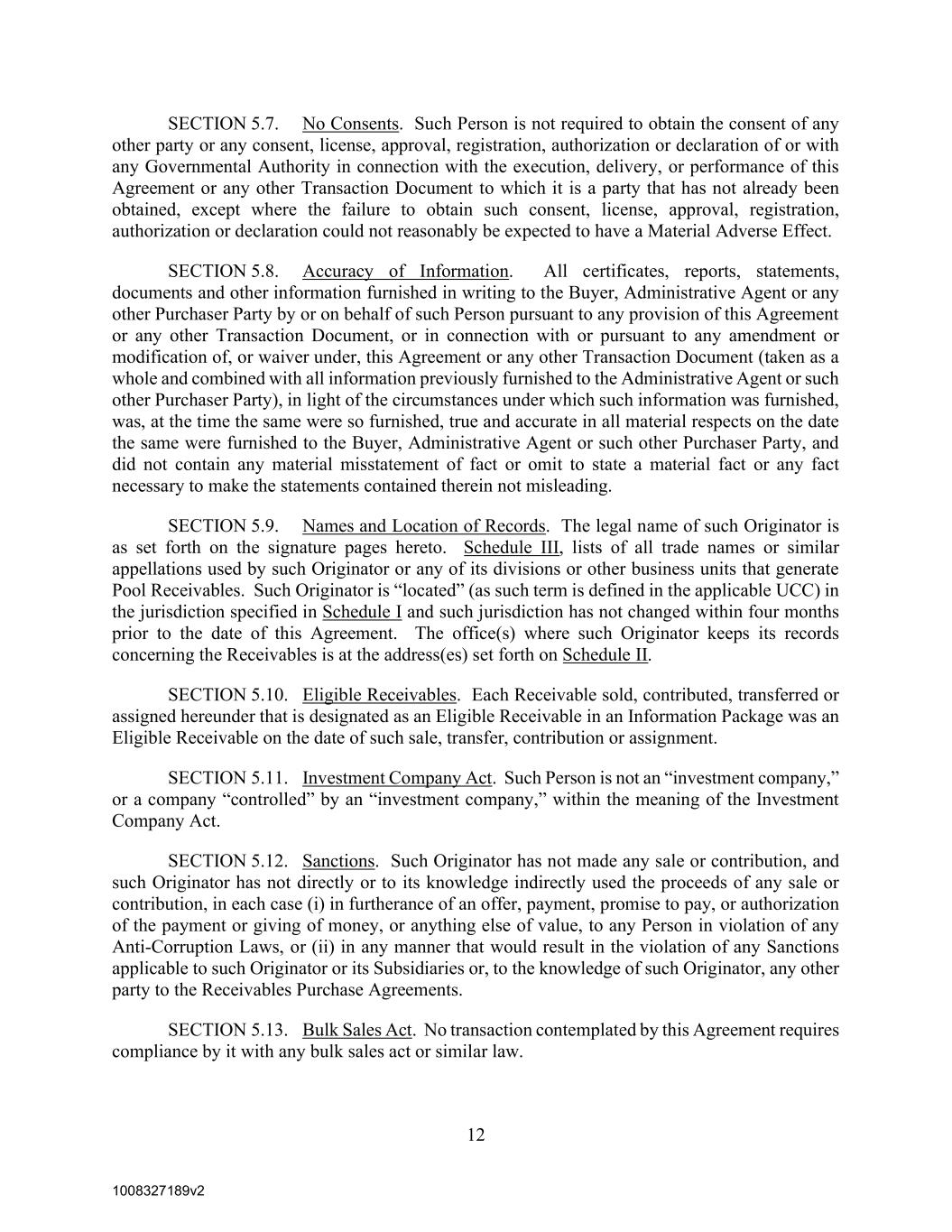 12 1008327189v2 SECTION 5.7. No Consents. Such Person is not required to obtain the consent of any other party or any consent, license, approval, registration, authorization or declaration of or with any Governmental Authority in connection with the execution, delivery, or performance of this Agreement or any other Transaction Document to which it is a party that has not already been obtained, except where the failure to obtain such consent, license, approval, registration, authorization or declaration could not reasonably be expected to have a Material Adverse Effect. SECTION 5.8. Accuracy of Information. All certificates, reports, statements, documents and other information furnished in writing to the Buyer, Administrative Agent or any other Purchaser Party by or on behalf of such Person pursuant to any provision of this Agreement or any other Transaction Document, or in connection with or pursuant to any amendment or modification of, or waiver under, this Agreement or any other Transaction Document (taken as a whole and combined with all information previously furnished to the Administrative Agent or such other Purchaser Party), in light of the circumstances under which such information was furnished, was, at the time the same were so furnished, true and accurate in all material respects on the date the same were furnished to the Buyer, Administrative Agent or such other Purchaser Party, and did not contain any material misstatement of fact or omit to state a material fact or any fact necessary to make the statements contained therein not misleading. SECTION 5.9. Names and Location of Records. The legal name of such Originator is as set forth on the signature pages hereto. Schedule III, lists of all trade names or similar appellations used by such Originator or any of its divisions or other business units that generate Pool Receivables. Such Originator is “located” (as such term is defined in the applicable UCC) in the jurisdiction specified in Schedule I and such jurisdiction has not changed within four months prior to the date of this Agreement. The office(s) where such Originator keeps its records concerning the Receivables is at the address(es) set forth on Schedule II. SECTION 5.10. Eligible Receivables. Each Receivable sold, contributed, transferred or assigned hereunder that is designated as an Eligible Receivable in an Information Package was an Eligible Receivable on the date of such sale, transfer, contribution or assignment. SECTION 5.11. Investment Company Act. Such Person is not an “investment company,” or a company “controlled” by an “investment company,” within the meaning of the Investment Company Act. SECTION 5.12. Sanctions. Such Originator has not made any sale or contribution, and such Originator has not directly or to its knowledge indirectly used the proceeds of any sale or contribution, in each case (i) in furtherance of an offer, payment, promise to pay, or authorization of the payment or giving of money, or anything else of value, to any Person in violation of any Anti-Corruption Laws, or (ii) in any manner that would result in the violation of any Sanctions applicable to such Originator or its Subsidiaries or, to the knowledge of such Originator, any other party to the Receivables Purchase Agreements. SECTION 5.13. Bulk Sales Act. No transaction contemplated by this Agreement requires compliance by it with any bulk sales act or similar law.