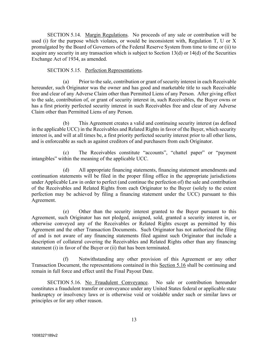 13 1008327189v2 SECTION 5.14. Margin Regulations. No proceeds of any sale or contribution will be used (i) for the purpose which violates, or would be inconsistent with, Regulation T, U or X promulgated by the Board of Governors of the Federal Reserve System from time to time or (ii) to acquire any security in any transaction which is subject to Section 13(d) or 14(d) of the Securities Exchange Act of 1934, as amended. SECTION 5.15. Perfection Representations. (a) Prior to the sale, contribution or grant of security interest in each Receivable hereunder, such Originator was the owner and has good and marketable title to such Receivable free and clear of any Adverse Claim other than Permitted Liens of any Person. After giving effect to the sale, contribution of, or grant of security interest in, such Receivables, the Buyer owns or has a first priority perfected security interest in such Receivables free and clear of any Adverse Claim other than Permitted Liens of any Person. (b) This Agreement creates a valid and continuing security interest (as defined in the applicable UCC) in the Receivables and Related Rights in favor of the Buyer, which security interest is, and will at all times be, a first priority perfected security interest prior to all other liens, and is enforceable as such as against creditors of and purchasers from each Originator. (c) The Receivables constitute “accounts”, “chattel paper” or “payment intangibles” within the meaning of the applicable UCC. (d) All appropriate financing statements, financing statement amendments and continuation statements will be filed in the proper filing office in the appropriate jurisdictions under Applicable Law in order to perfect (and continue the perfection of) the sale and contribution of the Receivables and Related Rights from each Originator to the Buyer (solely to the extent perfection may be achieved by filing a financing statement under the UCC) pursuant to this Agreement. (e) Other than the security interest granted to the Buyer pursuant to this Agreement, such Originator has not pledged, assigned, sold, granted a security interest in, or otherwise conveyed any of the Receivables or Related Rights except as permitted by this Agreement and the other Transaction Documents. Such Originator has not authorized the filing of and is not aware of any financing statements filed against such Originator that include a description of collateral covering the Receivables and Related Rights other than any financing statement (i) in favor of the Buyer or (ii) that has been terminated. (f) Notwithstanding any other provision of this Agreement or any other Transaction Document, the representations contained in this Section 5.16 shall be continuing and remain in full force and effect until the Final Payout Date. SECTION 5.16. No Fraudulent Conveyance. No sale or contribution hereunder constitutes a fraudulent transfer or conveyance under any United States federal or applicable state bankruptcy or insolvency laws or is otherwise void or voidable under such or similar laws or principles or for any other reason.
