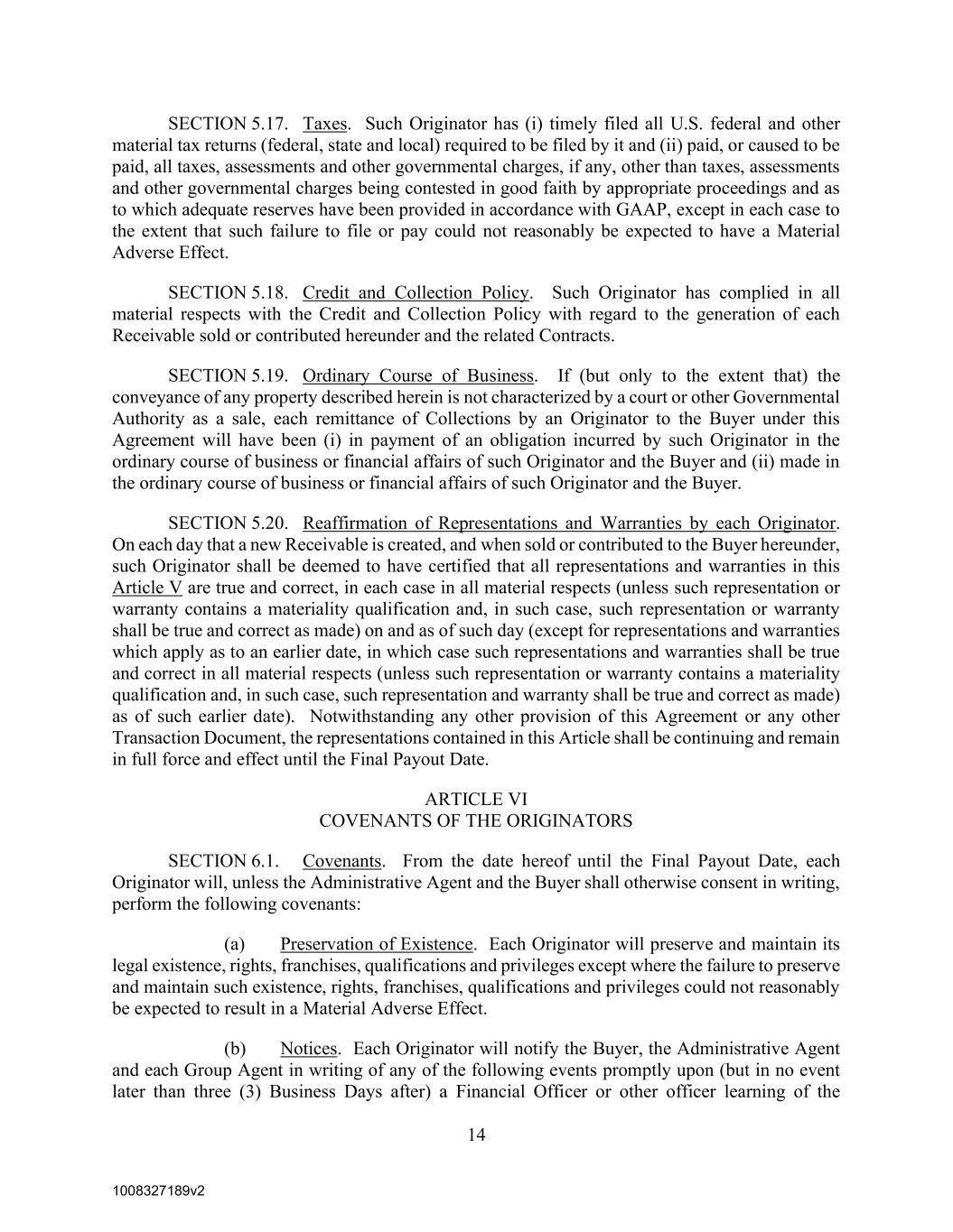 14 1008327189v2 SECTION 5.17. Taxes. Such Originator has (i) timely filed all U.S. federal and other material tax returns (federal, state and local) required to be filed by it and (ii) paid, or caused to be paid, all taxes, assessments and other governmental charges, if any, other than taxes, assessments and other governmental charges being contested in good faith by appropriate proceedings and as to which adequate reserves have been provided in accordance with GAAP, except in each case to the extent that such failure to file or pay could not reasonably be expected to have a Material Adverse Effect. SECTION 5.18. Credit and Collection Policy. Such Originator has complied in all material respects with the Credit and Collection Policy with regard to the generation of each Receivable sold or contributed hereunder and the related Contracts. SECTION 5.19. Ordinary Course of Business. If (but only to the extent that) the conveyance of any property described herein is not characterized by a court or other Governmental Authority as a sale, each remittance of Collections by an Originator to the Buyer under this Agreement will have been (i) in payment of an obligation incurred by such Originator in the ordinary course of business or financial affairs of such Originator and the Buyer and (ii) made in the ordinary course of business or financial affairs of such Originator and the Buyer. SECTION 5.20. Reaffirmation of Representations and Warranties by each Originator. On each day that a new Receivable is created, and when sold or contributed to the Buyer hereunder, such Originator shall be deemed to have certified that all representations and warranties in this Article V are true and correct, in each case in all material respects (unless such representation or warranty contains a materiality qualification and, in such case, such representation or warranty shall be true and correct as made) on and as of such day (except for representations and warranties which apply as to an earlier date, in which case such representations and warranties shall be true and correct in all material respects (unless such representation or warranty contains a materiality qualification and, in such case, such representation and warranty shall be true and correct as made) as of such earlier date). Notwithstanding any other provision of this Agreement or any other Transaction Document, the representations contained in this Article shall be continuing and remain in full force and effect until the Final Payout Date. ARTICLE VI COVENANTS OF THE ORIGINATORS SECTION 6.1. Covenants. From the date hereof until the Final Payout Date, each Originator will, unless the Administrative Agent and the Buyer shall otherwise consent in writing, perform the following covenants: (a) Preservation of Existence. Each Originator will preserve and maintain its legal existence, rights, franchises, qualifications and privileges except where the failure to preserve and maintain such existence, rights, franchises, qualifications and privileges could not reasonably be expected to result in a Material Adverse Effect. (b) Notices. Each Originator will notify the Buyer, the Administrative Agent and each Group Agent in writing of any of the following events promptly upon (but in no event later than three (3) Business Days after) a Financial Officer or other officer learning of the