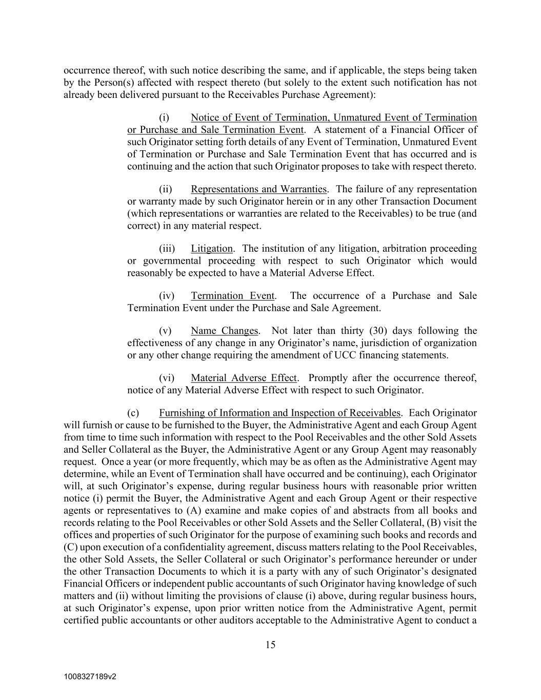 15 1008327189v2 occurrence thereof, with such notice describing the same, and if applicable, the steps being taken by the Person(s) affected with respect thereto (but solely to the extent such notification has not already been delivered pursuant to the Receivables Purchase Agreement): (i) Notice of Event of Termination, Unmatured Event of Termination or Purchase and Sale Termination Event. A statement of a Financial Officer of such Originator setting forth details of any Event of Termination, Unmatured Event of Termination or Purchase and Sale Termination Event that has occurred and is continuing and the action that such Originator proposes to take with respect thereto. (ii) Representations and Warranties. The failure of any representation or warranty made by such Originator herein or in any other Transaction Document (which representations or warranties are related to the Receivables) to be true (and correct) in any material respect. (iii) Litigation. The institution of any litigation, arbitration proceeding or governmental proceeding with respect to such Originator which would reasonably be expected to have a Material Adverse Effect. (iv) Termination Event. The occurrence of a Purchase and Sale Termination Event under the Purchase and Sale Agreement. (v) Name Changes. Not later than thirty (30) days following the effectiveness of any change in any Originator’s name, jurisdiction of organization or any other change requiring the amendment of UCC financing statements. (vi) Material Adverse Effect. Promptly after the occurrence thereof, notice of any Material Adverse Effect with respect to such Originator. (c) Furnishing of Information and Inspection of Receivables. Each Originator will furnish or cause to be furnished to the Buyer, the Administrative Agent and each Group Agent from time to time such information with respect to the Pool Receivables and the other Sold Assets and Seller Collateral as the Buyer, the Administrative Agent or any Group Agent may reasonably request. Once a year (or more frequently, which may be as often as the Administrative Agent may determine, while an Event of Termination shall have occurred and be continuing), each Originator will, at such Originator’s expense, during regular business hours with reasonable prior written notice (i) permit the Buyer, the Administrative Agent and each Group Agent or their respective agents or representatives to (A) examine and make copies of and abstracts from all books and records relating to the Pool Receivables or other Sold Assets and the Seller Collateral, (B) visit the offices and properties of such Originator for the purpose of examining such books and records and (C) upon execution of a confidentiality agreement, discuss matters relating to the Pool Receivables, the other Sold Assets, the Seller Collateral or such Originator’s performance hereunder or under the other Transaction Documents to which it is a party with any of such Originator’s designated Financial Officers or independent public accountants of such Originator having knowledge of such matters and (ii) without limiting the provisions of clause (i) above, during regular business hours, at such Originator’s expense, upon prior written notice from the Administrative Agent, permit certified public accountants or other auditors acceptable to the Administrative Agent to conduct a