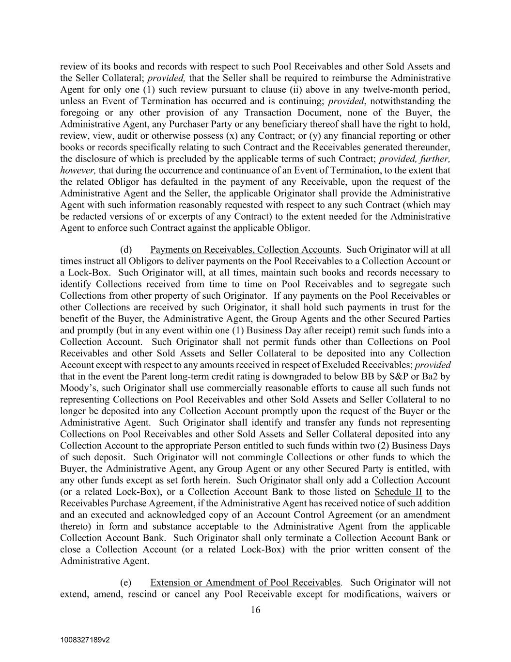 16 1008327189v2 review of its books and records with respect to such Pool Receivables and other Sold Assets and the Seller Collateral; provided, that the Seller shall be required to reimburse the Administrative Agent for only one (1) such review pursuant to clause (ii) above in any twelve-month period, unless an Event of Termination has occurred and is continuing; provided, notwithstanding the foregoing or any other provision of any Transaction Document, none of the Buyer, the Administrative Agent, any Purchaser Party or any beneficiary thereof shall have the right to hold, review, view, audit or otherwise possess (x) any Contract; or (y) any financial reporting or other books or records specifically relating to such Contract and the Receivables generated thereunder, the disclosure of which is precluded by the applicable terms of such Contract; provided, further, however, that during the occurrence and continuance of an Event of Termination, to the extent that the related Obligor has defaulted in the payment of any Receivable, upon the request of the Administrative Agent and the Seller, the applicable Originator shall provide the Administrative Agent with such information reasonably requested with respect to any such Contract (which may be redacted versions of or excerpts of any Contract) to the extent needed for the Administrative Agent to enforce such Contract against the applicable Obligor. (d) Payments on Receivables, Collection Accounts. Such Originator will at all times instruct all Obligors to deliver payments on the Pool Receivables to a Collection Account or a Lock-Box. Such Originator will, at all times, maintain such books and records necessary to identify Collections received from time to time on Pool Receivables and to segregate such Collections from other property of such Originator. If any payments on the Pool Receivables or other Collections are received by such Originator, it shall hold such payments in trust for the benefit of the Buyer, the Administrative Agent, the Group Agents and the other Secured Parties and promptly (but in any event within one (1) Business Day after receipt) remit such funds into a Collection Account. Such Originator shall not permit funds other than Collections on Pool Receivables and other Sold Assets and Seller Collateral to be deposited into any Collection Account except with respect to any amounts received in respect of Excluded Receivables; provided that in the event the Parent long-term credit rating is downgraded to below BB by S&P or Ba2 by Moody’s, such Originator shall use commercially reasonable efforts to cause all such funds not representing Collections on Pool Receivables and other Sold Assets and Seller Collateral to no longer be deposited into any Collection Account promptly upon the request of the Buyer or the Administrative Agent. Such Originator shall identify and transfer any funds not representing Collections on Pool Receivables and other Sold Assets and Seller Collateral deposited into any Collection Account to the appropriate Person entitled to such funds within two (2) Business Days of such deposit. Such Originator will not commingle Collections or other funds to which the Buyer, the Administrative Agent, any Group Agent or any other Secured Party is entitled, with any other funds except as set forth herein. Such Originator shall only add a Collection Account (or a related Lock-Box), or a Collection Account Bank to those listed on Schedule II to the Receivables Purchase Agreement, if the Administrative Agent has received notice of such addition and an executed and acknowledged copy of an Account Control Agreement (or an amendment thereto) in form and substance acceptable to the Administrative Agent from the applicable Collection Account Bank. Such Originator shall only terminate a Collection Account Bank or close a Collection Account (or a related Lock-Box) with the prior written consent of the Administrative Agent. (e) Extension or Amendment of Pool Receivables. Such Originator will not extend, amend, rescind or cancel any Pool Receivable except for modifications, waivers or