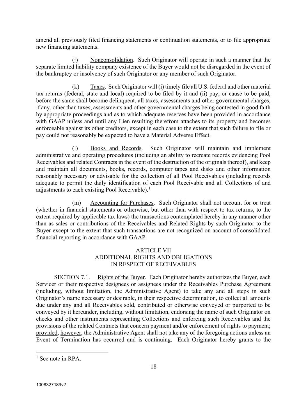 18 1008327189v2 amend all previously filed financing statements or continuation statements, or to file appropriate new financing statements. (j) Nonconsolidation. Such Originator will operate in such a manner that the separate limited liability company existence of the Buyer would not be disregarded in the event of the bankruptcy or insolvency of such Originator or any member of such Originator. (k) Taxes. Such Originator will (i) timely file all U.S. federal and other material tax returns (federal, state and local) required to be filed by it and (ii) pay, or cause to be paid, before the same shall become delinquent, all taxes, assessments and other governmental charges, if any, other than taxes, assessments and other governmental charges being contested in good faith by appropriate proceedings and as to which adequate reserves have been provided in accordance with GAAP unless and until any Lien resulting therefrom attaches to its property and becomes enforceable against its other creditors, except in each case to the extent that such failure to file or pay could not reasonably be expected to have a Material Adverse Effect. (l) Books and Records. Such Originator will maintain and implement administrative and operating procedures (including an ability to recreate records evidencing Pool Receivables and related Contracts in the event of the destruction of the originals thereof), and keep and maintain all documents, books, records, computer tapes and disks and other information reasonably necessary or advisable for the collection of all Pool Receivables (including records adequate to permit the daily identification of each Pool Receivable and all Collections of and adjustments to each existing Pool Receivable).1 (m) Accounting for Purchases. Such Originator shall not account for or treat (whether in financial statements or otherwise, but other than with respect to tax returns, to the extent required by applicable tax laws) the transactions contemplated hereby in any manner other than as sales or contributions of the Receivables and Related Rights by such Originator to the Buyer except to the extent that such transactions are not recognized on account of consolidated financial reporting in accordance with GAAP. ARTICLE VII ADDITIONAL RIGHTS AND OBLIGATIONS IN RESPECT OF RECEIVABLES SECTION 7.1. Rights of the Buyer. Each Originator hereby authorizes the Buyer, each Servicer or their respective designees or assignees under the Receivables Purchase Agreement (including, without limitation, the Administrative Agent) to take any and all steps in such Originator’s name necessary or desirable, in their respective determination, to collect all amounts due under any and all Receivables sold, contributed or otherwise conveyed or purported to be conveyed by it hereunder, including, without limitation, endorsing the name of such Originator on checks and other instruments representing Collections and enforcing such Receivables and the provisions of the related Contracts that concern payment and/or enforcement of rights to payment; provided, however, the Administrative Agent shall not take any of the foregoing actions unless an Event of Termination has occurred and is continuing. Each Originator hereby grants to the 1 See note in RPA.