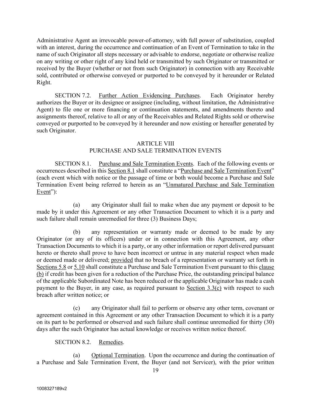 19 1008327189v2 Administrative Agent an irrevocable power-of-attorney, with full power of substitution, coupled with an interest, during the occurrence and continuation of an Event of Termination to take in the name of such Originator all steps necessary or advisable to endorse, negotiate or otherwise realize on any writing or other right of any kind held or transmitted by such Originator or transmitted or received by the Buyer (whether or not from such Originator) in connection with any Receivable sold, contributed or otherwise conveyed or purported to be conveyed by it hereunder or Related Right. SECTION 7.2. Further Action Evidencing Purchases. Each Originator hereby authorizes the Buyer or its designee or assignee (including, without limitation, the Administrative Agent) to file one or more financing or continuation statements, and amendments thereto and assignments thereof, relative to all or any of the Receivables and Related Rights sold or otherwise conveyed or purported to be conveyed by it hereunder and now existing or hereafter generated by such Originator. ARTICLE VIII PURCHASE AND SALE TERMINATION EVENTS SECTION 8.1. Purchase and Sale Termination Events. Each of the following events or occurrences described in this Section 8.1 shall constitute a “Purchase and Sale Termination Event” (each event which with notice or the passage of time or both would become a Purchase and Sale Termination Event being referred to herein as an “Unmatured Purchase and Sale Termination Event”): (a) any Originator shall fail to make when due any payment or deposit to be made by it under this Agreement or any other Transaction Document to which it is a party and such failure shall remain unremedied for three (3) Business Days; (b) any representation or warranty made or deemed to be made by any Originator (or any of its officers) under or in connection with this Agreement, any other Transaction Documents to which it is a party, or any other information or report delivered pursuant hereto or thereto shall prove to have been incorrect or untrue in any material respect when made or deemed made or delivered; provided that no breach of a representation or warranty set forth in Sections 5.8 or 5.10 shall constitute a Purchase and Sale Termination Event pursuant to this clause (b) if credit has been given for a reduction of the Purchase Price, the outstanding principal balance of the applicable Subordinated Note has been reduced or the applicable Originator has made a cash payment to the Buyer, in any case, as required pursuant to Section 3.3(c) with respect to such breach after written notice; or (c) any Originator shall fail to perform or observe any other term, covenant or agreement contained in this Agreement or any other Transaction Document to which it is a party on its part to be performed or observed and such failure shall continue unremedied for thirty (30) days after the such Originator has actual knowledge or receives written notice thereof. SECTION 8.2. Remedies. (a) Optional Termination. Upon the occurrence and during the continuation of a Purchase and Sale Termination Event, the Buyer (and not Servicer), with the prior written