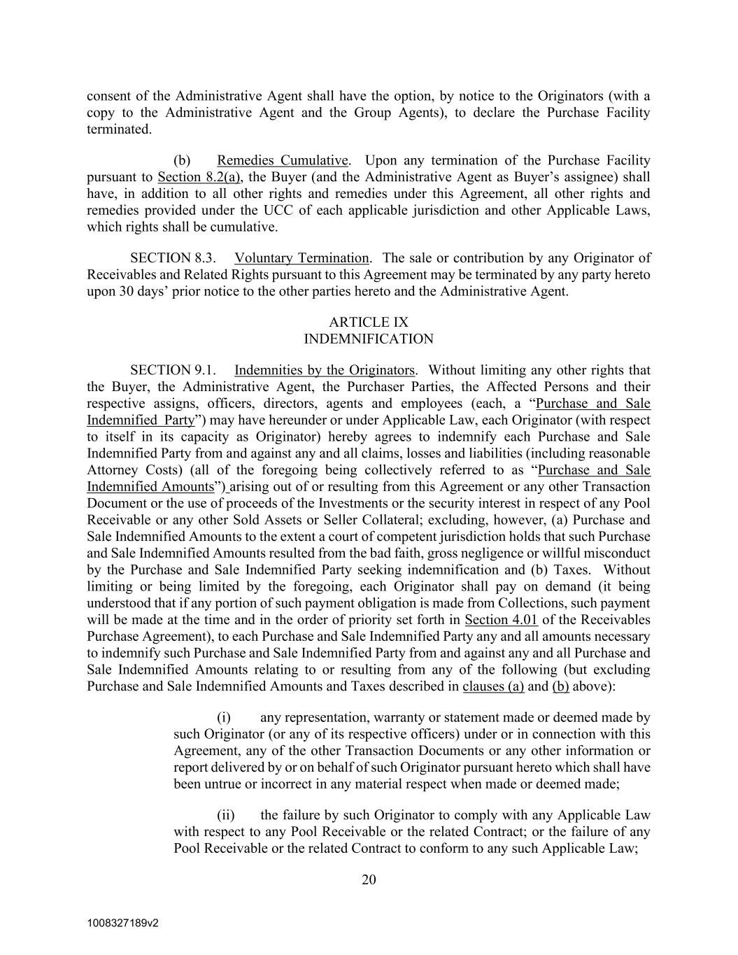 20 1008327189v2 consent of the Administrative Agent shall have the option, by notice to the Originators (with a copy to the Administrative Agent and the Group Agents), to declare the Purchase Facility terminated. (b) Remedies Cumulative. Upon any termination of the Purchase Facility pursuant to Section 8.2(a), the Buyer (and the Administrative Agent as Buyer’s assignee) shall have, in addition to all other rights and remedies under this Agreement, all other rights and remedies provided under the UCC of each applicable jurisdiction and other Applicable Laws, which rights shall be cumulative. SECTION 8.3. Voluntary Termination. The sale or contribution by any Originator of Receivables and Related Rights pursuant to this Agreement may be terminated by any party hereto upon 30 days’ prior notice to the other parties hereto and the Administrative Agent. ARTICLE IX INDEMNIFICATION SECTION 9.1. Indemnities by the Originators. Without limiting any other rights that the Buyer, the Administrative Agent, the Purchaser Parties, the Affected Persons and their respective assigns, officers, directors, agents and employees (each, a “Purchase and Sale Indemnified Party”) may have hereunder or under Applicable Law, each Originator (with respect to itself in its capacity as Originator) hereby agrees to indemnify each Purchase and Sale Indemnified Party from and against any and all claims, losses and liabilities (including reasonable Attorney Costs) (all of the foregoing being collectively referred to as “Purchase and Sale Indemnified Amounts”) arising out of or resulting from this Agreement or any other Transaction Document or the use of proceeds of the Investments or the security interest in respect of any Pool Receivable or any other Sold Assets or Seller Collateral; excluding, however, (a) Purchase and Sale Indemnified Amounts to the extent a court of competent jurisdiction holds that such Purchase and Sale Indemnified Amounts resulted from the bad faith, gross negligence or willful misconduct by the Purchase and Sale Indemnified Party seeking indemnification and (b) Taxes. Without limiting or being limited by the foregoing, each Originator shall pay on demand (it being understood that if any portion of such payment obligation is made from Collections, such payment will be made at the time and in the order of priority set forth in Section 4.01 of the Receivables Purchase Agreement), to each Purchase and Sale Indemnified Party any and all amounts necessary to indemnify such Purchase and Sale Indemnified Party from and against any and all Purchase and Sale Indemnified Amounts relating to or resulting from any of the following (but excluding Purchase and Sale Indemnified Amounts and Taxes described in clauses (a) and (b) above): (i) any representation, warranty or statement made or deemed made by such Originator (or any of its respective officers) under or in connection with this Agreement, any of the other Transaction Documents or any other information or report delivered by or on behalf of such Originator pursuant hereto which shall have been untrue or incorrect in any material respect when made or deemed made; (ii) the failure by such Originator to comply with any Applicable Law with respect to any Pool Receivable or the related Contract; or the failure of any Pool Receivable or the related Contract to conform to any such Applicable Law;