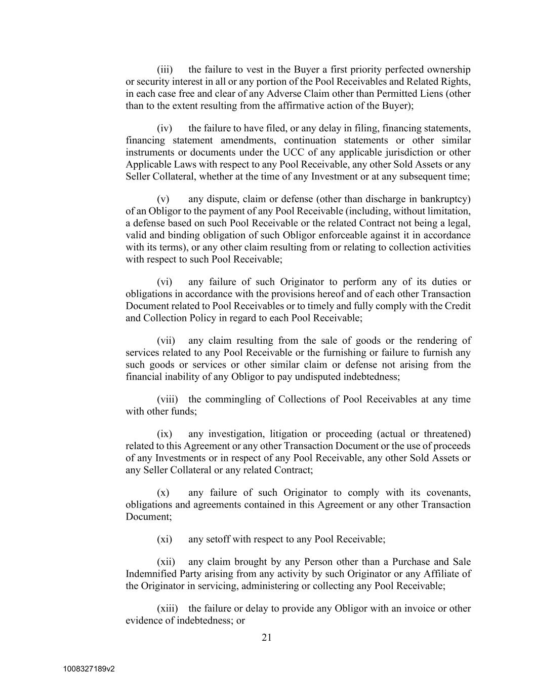 21 1008327189v2 (iii) the failure to vest in the Buyer a first priority perfected ownership or security interest in all or any portion of the Pool Receivables and Related Rights, in each case free and clear of any Adverse Claim other than Permitted Liens (other than to the extent resulting from the affirmative action of the Buyer); (iv) the failure to have filed, or any delay in filing, financing statements, financing statement amendments, continuation statements or other similar instruments or documents under the UCC of any applicable jurisdiction or other Applicable Laws with respect to any Pool Receivable, any other Sold Assets or any Seller Collateral, whether at the time of any Investment or at any subsequent time; (v) any dispute, claim or defense (other than discharge in bankruptcy) of an Obligor to the payment of any Pool Receivable (including, without limitation, a defense based on such Pool Receivable or the related Contract not being a legal, valid and binding obligation of such Obligor enforceable against it in accordance with its terms), or any other claim resulting from or relating to collection activities with respect to such Pool Receivable; (vi) any failure of such Originator to perform any of its duties or obligations in accordance with the provisions hereof and of each other Transaction Document related to Pool Receivables or to timely and fully comply with the Credit and Collection Policy in regard to each Pool Receivable; (vii) any claim resulting from the sale of goods or the rendering of services related to any Pool Receivable or the furnishing or failure to furnish any such goods or services or other similar claim or defense not arising from the financial inability of any Obligor to pay undisputed indebtedness; (viii) the commingling of Collections of Pool Receivables at any time with other funds; (ix) any investigation, litigation or proceeding (actual or threatened) related to this Agreement or any other Transaction Document or the use of proceeds of any Investments or in respect of any Pool Receivable, any other Sold Assets or any Seller Collateral or any related Contract; (x) any failure of such Originator to comply with its covenants, obligations and agreements contained in this Agreement or any other Transaction Document; (xi) any setoff with respect to any Pool Receivable; (xii) any claim brought by any Person other than a Purchase and Sale Indemnified Party arising from any activity by such Originator or any Affiliate of the Originator in servicing, administering or collecting any Pool Receivable; (xiii) the failure or delay to provide any Obligor with an invoice or other evidence of indebtedness; or