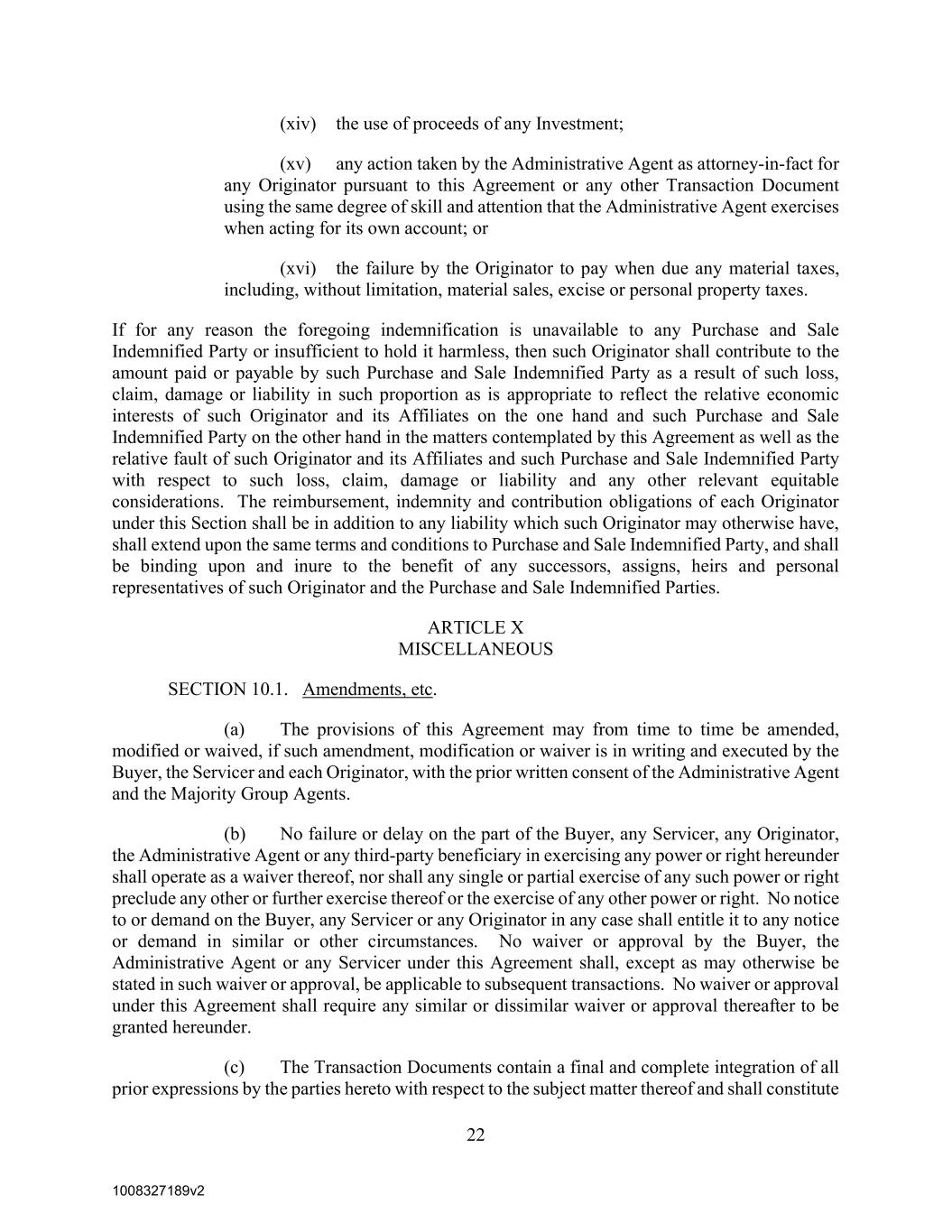 22 1008327189v2 (xiv) the use of proceeds of any Investment; (xv) any action taken by the Administrative Agent as attorney-in-fact for any Originator pursuant to this Agreement or any other Transaction Document using the same degree of skill and attention that the Administrative Agent exercises when acting for its own account; or (xvi) the failure by the Originator to pay when due any material taxes, including, without limitation, material sales, excise or personal property taxes. If for any reason the foregoing indemnification is unavailable to any Purchase and Sale Indemnified Party or insufficient to hold it harmless, then such Originator shall contribute to the amount paid or payable by such Purchase and Sale Indemnified Party as a result of such loss, claim, damage or liability in such proportion as is appropriate to reflect the relative economic interests of such Originator and its Affiliates on the one hand and such Purchase and Sale Indemnified Party on the other hand in the matters contemplated by this Agreement as well as the relative fault of such Originator and its Affiliates and such Purchase and Sale Indemnified Party with respect to such loss, claim, damage or liability and any other relevant equitable considerations. The reimbursement, indemnity and contribution obligations of each Originator under this Section shall be in addition to any liability which such Originator may otherwise have, shall extend upon the same terms and conditions to Purchase and Sale Indemnified Party, and shall be binding upon and inure to the benefit of any successors, assigns, heirs and personal representatives of such Originator and the Purchase and Sale Indemnified Parties. ARTICLE X MISCELLANEOUS SECTION 10.1. Amendments, etc. (a) The provisions of this Agreement may from time to time be amended, modified or waived, if such amendment, modification or waiver is in writing and executed by the Buyer, the Servicer and each Originator, with the prior written consent of the Administrative Agent and the Majority Group Agents. (b) No failure or delay on the part of the Buyer, any Servicer, any Originator, the Administrative Agent or any third-party beneficiary in exercising any power or right hereunder shall operate as a waiver thereof, nor shall any single or partial exercise of any such power or right preclude any other or further exercise thereof or the exercise of any other power or right. No notice to or demand on the Buyer, any Servicer or any Originator in any case shall entitle it to any notice or demand in similar or other circumstances. No waiver or approval by the Buyer, the Administrative Agent or any Servicer under this Agreement shall, except as may otherwise be stated in such waiver or approval, be applicable to subsequent transactions. No waiver or approval under this Agreement shall require any similar or dissimilar waiver or approval thereafter to be granted hereunder. (c) The Transaction Documents contain a final and complete integration of all prior expressions by the parties hereto with respect to the subject matter thereof and shall constitute