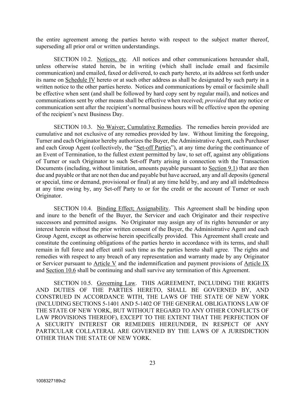 23 1008327189v2 the entire agreement among the parties hereto with respect to the subject matter thereof, superseding all prior oral or written understandings. SECTION 10.2. Notices, etc. All notices and other communications hereunder shall, unless otherwise stated herein, be in writing (which shall include email and facsimile communication) and emailed, faxed or delivered, to each party hereto, at its address set forth under its name on Schedule IV hereto or at such other address as shall be designated by such party in a written notice to the other parties hereto. Notices and communications by email or facsimile shall be effective when sent (and shall be followed by hard copy sent by regular mail), and notices and communications sent by other means shall be effective when received; provided that any notice or communication sent after the recipient’s normal business hours will be effective upon the opening of the recipient’s next Business Day. SECTION 10.3. No Waiver; Cumulative Remedies. The remedies herein provided are cumulative and not exclusive of any remedies provided by law. Without limiting the foregoing, Turner and each Originator hereby authorizes the Buyer, the Administrative Agent, each Purchaser and each Group Agent (collectively, the “Set-off Parties”), at any time during the continuance of an Event of Termination, to the fullest extent permitted by law, to set off, against any obligations of Turner or such Originator to such Set-off Party arising in connection with the Transaction Documents (including, without limitation, amounts payable pursuant to Section 9.1) that are then due and payable or that are not then due and payable but have accrued, any and all deposits (general or special, time or demand, provisional or final) at any time held by, and any and all indebtedness at any time owing by, any Set-off Party to or for the credit or the account of Turner or such Originator. SECTION 10.4. Binding Effect; Assignability. This Agreement shall be binding upon and inure to the benefit of the Buyer, the Servicer and each Originator and their respective successors and permitted assigns. No Originator may assign any of its rights hereunder or any interest herein without the prior written consent of the Buyer, the Administrative Agent and each Group Agent, except as otherwise herein specifically provided. This Agreement shall create and constitute the continuing obligations of the parties hereto in accordance with its terms, and shall remain in full force and effect until such time as the parties hereto shall agree. The rights and remedies with respect to any breach of any representation and warranty made by any Originator or Servicer pursuant to Article V and the indemnification and payment provisions of Article IX and Section 10.6 shall be continuing and shall survive any termination of this Agreement. SECTION 10.5. Governing Law. THIS AGREEMENT, INCLUDING THE RIGHTS AND DUTIES OF THE PARTIES HERETO, SHALL BE GOVERNED BY, AND CONSTRUED IN ACCORDANCE WITH, THE LAWS OF THE STATE OF NEW YORK (INCLUDING SECTIONS 5-1401 AND 5-1402 OF THE GENERAL OBLIGATIONS LAW OF THE STATE OF NEW YORK, BUT WITHOUT REGARD TO ANY OTHER CONFLICTS OF LAW PROVISIONS THEREOF), EXCEPT TO THE EXTENT THAT THE PERFECTION OF A SECURITY INTEREST OR REMEDIES HEREUNDER, IN RESPECT OF ANY PARTICULAR COLLATERAL ARE GOVERNED BY THE LAWS OF A JURISDICTION OTHER THAN THE STATE OF NEW YORK.