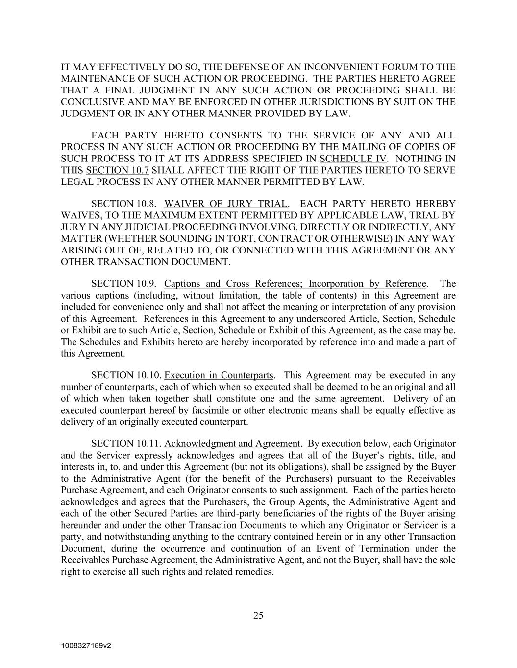 25 1008327189v2 IT MAY EFFECTIVELY DO SO, THE DEFENSE OF AN INCONVENIENT FORUM TO THE MAINTENANCE OF SUCH ACTION OR PROCEEDING. THE PARTIES HERETO AGREE THAT A FINAL JUDGMENT IN ANY SUCH ACTION OR PROCEEDING SHALL BE CONCLUSIVE AND MAY BE ENFORCED IN OTHER JURISDICTIONS BY SUIT ON THE JUDGMENT OR IN ANY OTHER MANNER PROVIDED BY LAW. EACH PARTY HERETO CONSENTS TO THE SERVICE OF ANY AND ALL PROCESS IN ANY SUCH ACTION OR PROCEEDING BY THE MAILING OF COPIES OF SUCH PROCESS TO IT AT ITS ADDRESS SPECIFIED IN SCHEDULE IV. NOTHING IN THIS SECTION 10.7 SHALL AFFECT THE RIGHT OF THE PARTIES HERETO TO SERVE LEGAL PROCESS IN ANY OTHER MANNER PERMITTED BY LAW. SECTION 10.8. WAIVER OF JURY TRIAL. EACH PARTY HERETO HEREBY WAIVES, TO THE MAXIMUM EXTENT PERMITTED BY APPLICABLE LAW, TRIAL BY JURY IN ANY JUDICIAL PROCEEDING INVOLVING, DIRECTLY OR INDIRECTLY, ANY MATTER (WHETHER SOUNDING IN TORT, CONTRACT OR OTHERWISE) IN ANY WAY ARISING OUT OF, RELATED TO, OR CONNECTED WITH THIS AGREEMENT OR ANY OTHER TRANSACTION DOCUMENT. SECTION 10.9. Captions and Cross References; Incorporation by Reference. The various captions (including, without limitation, the table of contents) in this Agreement are included for convenience only and shall not affect the meaning or interpretation of any provision of this Agreement. References in this Agreement to any underscored Article, Section, Schedule or Exhibit are to such Article, Section, Schedule or Exhibit of this Agreement, as the case may be. The Schedules and Exhibits hereto are hereby incorporated by reference into and made a part of this Agreement. SECTION 10.10. Execution in Counterparts. This Agreement may be executed in any number of counterparts, each of which when so executed shall be deemed to be an original and all of which when taken together shall constitute one and the same agreement. Delivery of an executed counterpart hereof by facsimile or other electronic means shall be equally effective as delivery of an originally executed counterpart. SECTION 10.11. Acknowledgment and Agreement. By execution below, each Originator and the Servicer expressly acknowledges and agrees that all of the Buyer’s rights, title, and interests in, to, and under this Agreement (but not its obligations), shall be assigned by the Buyer to the Administrative Agent (for the benefit of the Purchasers) pursuant to the Receivables Purchase Agreement, and each Originator consents to such assignment. Each of the parties hereto acknowledges and agrees that the Purchasers, the Group Agents, the Administrative Agent and each of the other Secured Parties are third-party beneficiaries of the rights of the Buyer arising hereunder and under the other Transaction Documents to which any Originator or Servicer is a party, and notwithstanding anything to the contrary contained herein or in any other Transaction Document, during the occurrence and continuation of an Event of Termination under the Receivables Purchase Agreement, the Administrative Agent, and not the Buyer, shall have the sole right to exercise all such rights and related remedies.
