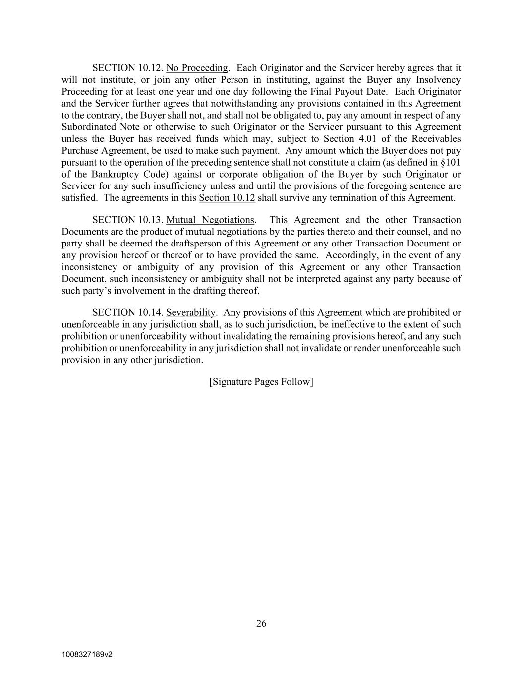 26 1008327189v2 SECTION 10.12. No Proceeding. Each Originator and the Servicer hereby agrees that it will not institute, or join any other Person in instituting, against the Buyer any Insolvency Proceeding for at least one year and one day following the Final Payout Date. Each Originator and the Servicer further agrees that notwithstanding any provisions contained in this Agreement to the contrary, the Buyer shall not, and shall not be obligated to, pay any amount in respect of any Subordinated Note or otherwise to such Originator or the Servicer pursuant to this Agreement unless the Buyer has received funds which may, subject to Section 4.01 of the Receivables Purchase Agreement, be used to make such payment. Any amount which the Buyer does not pay pursuant to the operation of the preceding sentence shall not constitute a claim (as defined in §101 of the Bankruptcy Code) against or corporate obligation of the Buyer by such Originator or Servicer for any such insufficiency unless and until the provisions of the foregoing sentence are satisfied. The agreements in this Section 10.12 shall survive any termination of this Agreement. SECTION 10.13. Mutual Negotiations. This Agreement and the other Transaction Documents are the product of mutual negotiations by the parties thereto and their counsel, and no party shall be deemed the draftsperson of this Agreement or any other Transaction Document or any provision hereof or thereof or to have provided the same. Accordingly, in the event of any inconsistency or ambiguity of any provision of this Agreement or any other Transaction Document, such inconsistency or ambiguity shall not be interpreted against any party because of such party’s involvement in the drafting thereof. SECTION 10.14. Severability. Any provisions of this Agreement which are prohibited or unenforceable in any jurisdiction shall, as to such jurisdiction, be ineffective to the extent of such prohibition or unenforceability without invalidating the remaining provisions hereof, and any such prohibition or unenforceability in any jurisdiction shall not invalidate or render unenforceable such provision in any other jurisdiction. [Signature Pages Follow]