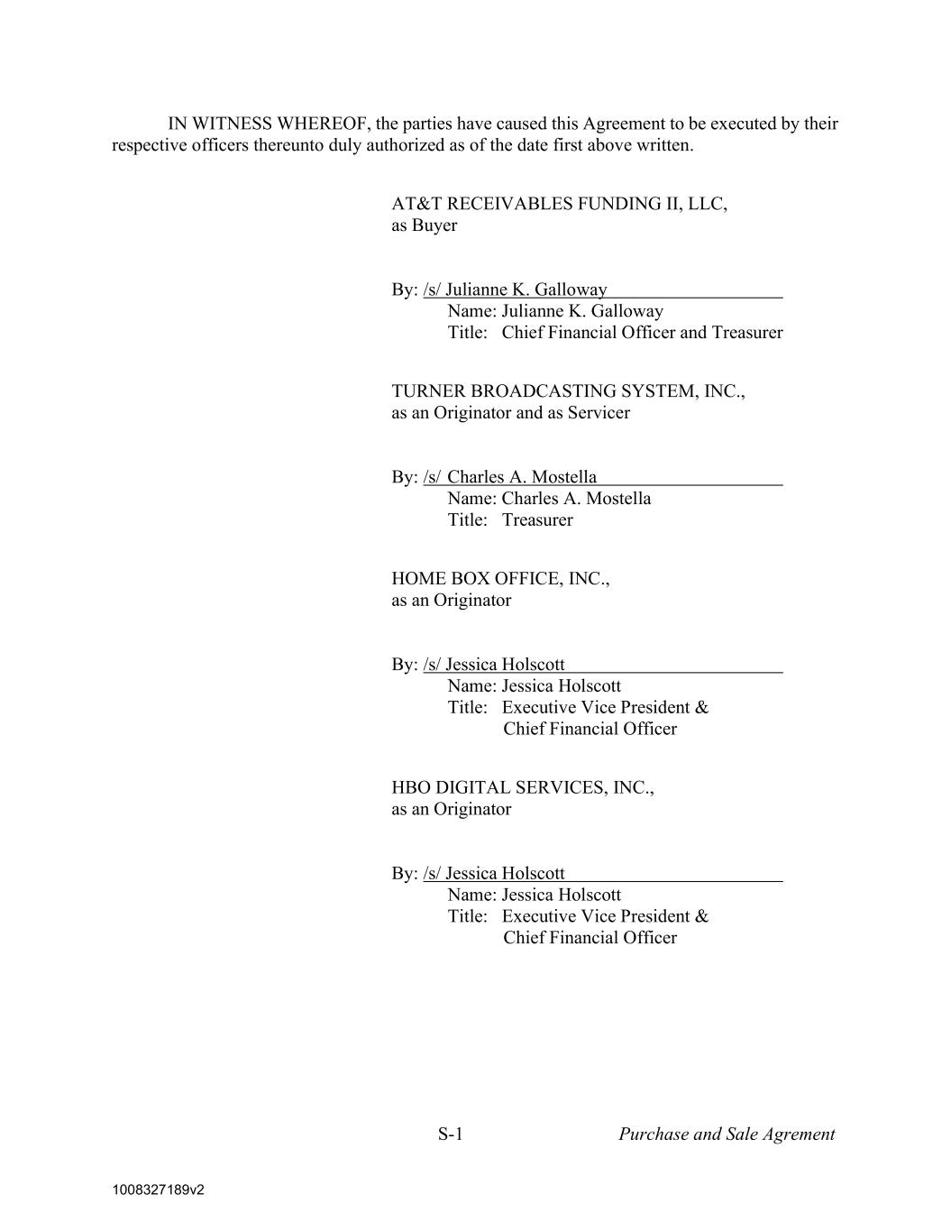 S-1 Purchase and Sale Agrement 1008327189v2 IN WITNESS WHEREOF, the parties have caused this Agreement to be executed by their respective officers thereunto duly authorized as of the date first above written. AT&T RECEIVABLES FUNDING II, LLC, as Buyer By: /s/ Julianne K. Galloway Name: Julianne K. Galloway Title: Chief Financial Officer and Treasurer TURNER BROADCASTING SYSTEM, INC., as an Originator and as Servicer By: /s/ Charles A. Mostella Name: Charles A. Mostella Title: Treasurer HOME BOX OFFICE, INC., as an Originator By: /s/ Jessica Holscott Name: Jessica Holscott Title: Executive Vice President & Chief Financial Officer HBO DIGITAL SERVICES, INC., as an Originator By: /s/ Jessica Holscott Name: Jessica Holscott Title: Executive Vice President & Chief Financial Officer