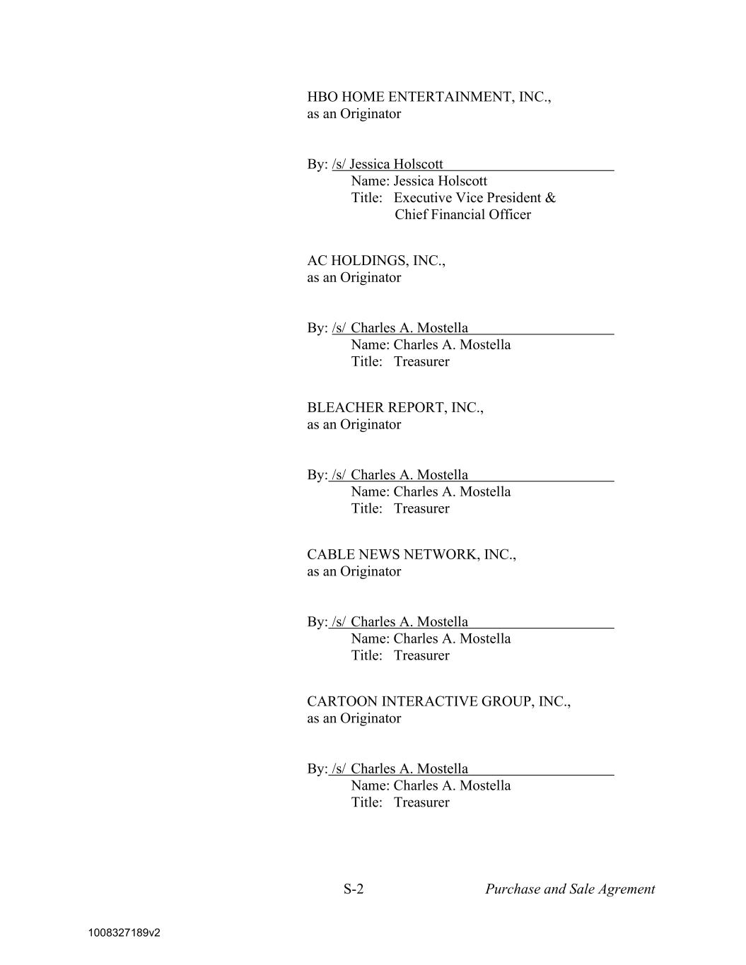 S-2 Purchase and Sale Agrement 1008327189v2 HBO HOME ENTERTAINMENT, INC., as an Originator By: /s/ Jessica Holscott Name: Jessica Holscott Title: Executive Vice President & Chief Financial Officer AC HOLDINGS, INC., as an Originator By: /s/ Charles A. Mostella Name: Charles A. Mostella Title: Treasurer BLEACHER REPORT, INC., as an Originator By: /s/ Charles A. Mostella Name: Charles A. Mostella Title: Treasurer CABLE NEWS NETWORK, INC., as an Originator By: /s/ Charles A. Mostella Name: Charles A. Mostella Title: Treasurer CARTOON INTERACTIVE GROUP, INC., as an Originator By: /s/ Charles A. Mostella Name: Charles A. Mostella Title: Treasurer
