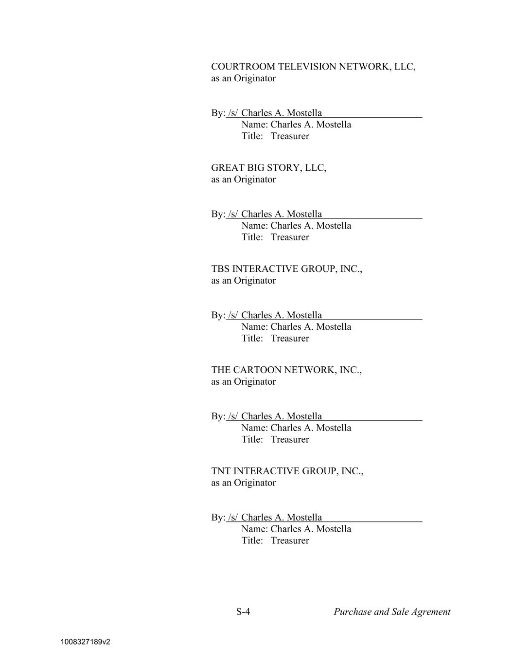 S-4 Purchase and Sale Agrement 1008327189v2 COURTROOM TELEVISION NETWORK, LLC, as an Originator By: /s/ Charles A. Mostella Name: Charles A. Mostella Title: Treasurer GREAT BIG STORY, LLC, as an Originator By: /s/ Charles A. Mostella Name: Charles A. Mostella Title: Treasurer TBS INTERACTIVE GROUP, INC., as an Originator By: /s/ Charles A. Mostella Name: Charles A. Mostella Title: Treasurer THE CARTOON NETWORK, INC., as an Originator By: /s/ Charles A. Mostella Name: Charles A. Mostella Title: Treasurer TNT INTERACTIVE GROUP, INC., as an Originator By: /s/ Charles A. Mostella Name: Charles A. Mostella Title: Treasurer