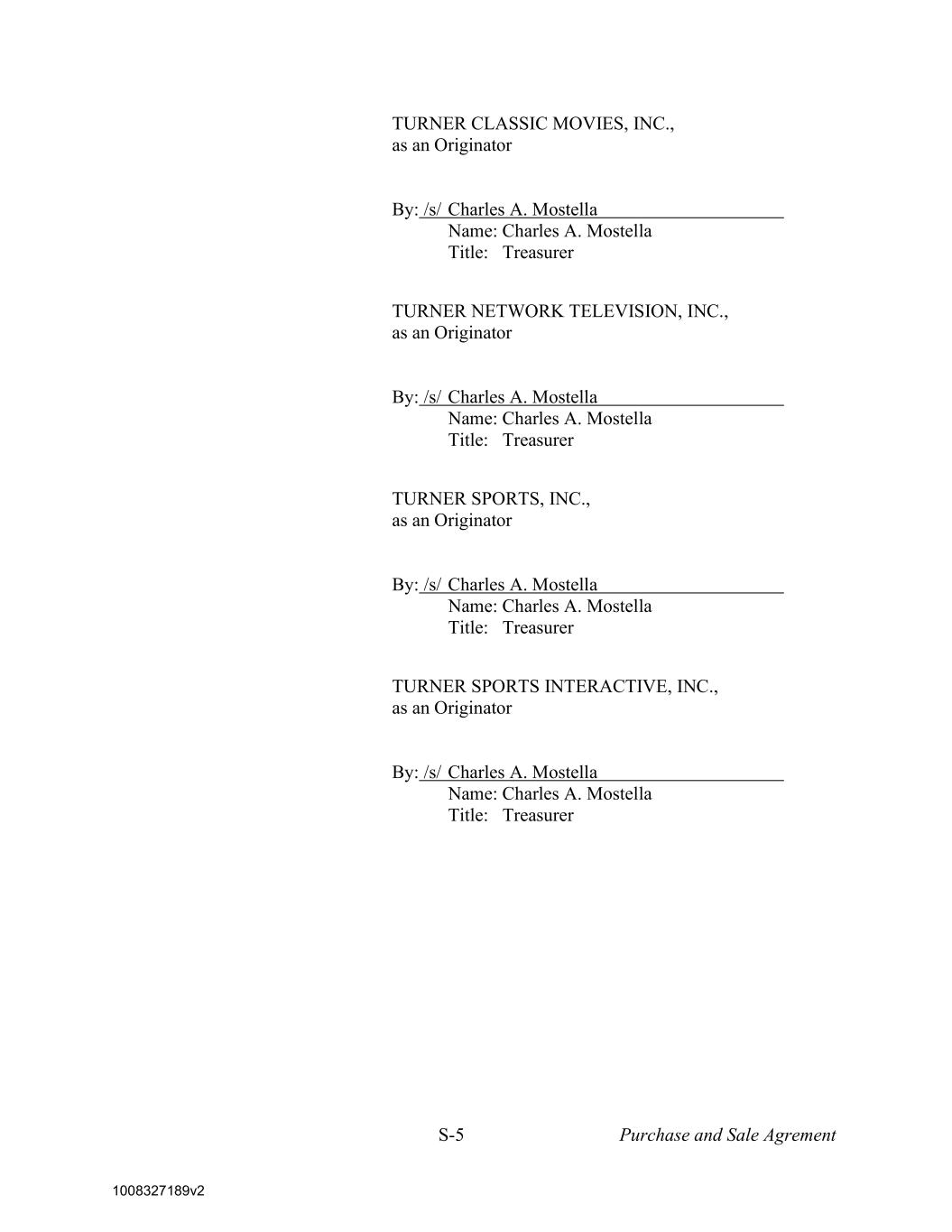 S-5 Purchase and Sale Agrement 1008327189v2 TURNER CLASSIC MOVIES, INC., as an Originator By: /s/ Charles A. Mostella Name: Charles A. Mostella Title: Treasurer TURNER NETWORK TELEVISION, INC., as an Originator By: /s/ Charles A. Mostella Name: Charles A. Mostella Title: Treasurer TURNER SPORTS, INC., as an Originator By: /s/ Charles A. Mostella Name: Charles A. Mostella Title: Treasurer TURNER SPORTS INTERACTIVE, INC., as an Originator By: /s/ Charles A. Mostella Name: Charles A. Mostella Title: Treasurer