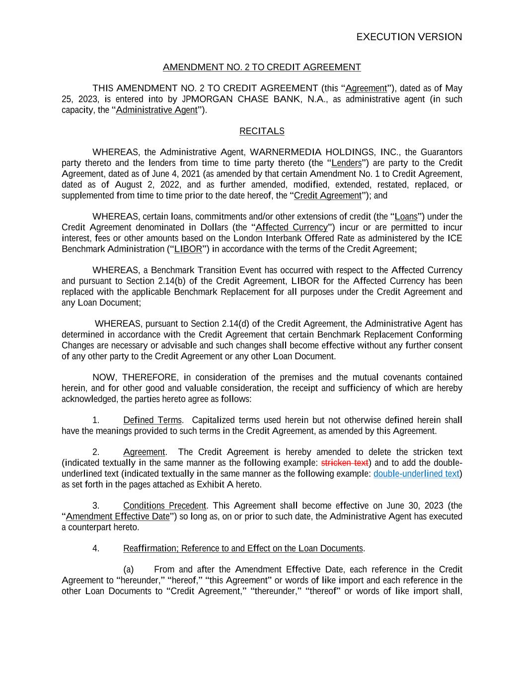 EXECUTION VERSION AMENDMENT NO. 2 TO CREDIT AGREEMENT THIS AMENDMENT NO. 2 TO CREDIT AGREEMENT (this “Agreement”), dated as of May 25, 2023, is entered into by JPMORGAN CHASE BANK, N.A., as administrative agent (in such capacity, the “Administrative Agent”). RECITALS WHEREAS, the Administrative Agent, WARNERMEDIA HOLDINGS, INC., the Guarantors party thereto and the lenders from time to time party thereto (the “Lenders”) are party to the Credit Agreement, dated as of June 4, 2021 (as amended by that certain Amendment No. 1 to Credit Agreement, dated as of August 2, 2022, and as further amended, modified, extended, restated, replaced, or supplemented from time to time prior to the date hereof, the “Credit Agreement”); and WHEREAS, certain loans, commitments and/or other extensions of credit (the “Loans”) under the Credit Agreement denominated in Dollars (the “Affected Currency”) incur or are permitted to incur interest, fees or other amounts based on the London Interbank Offered Rate as administered by the ICE Benchmark Administration (“LIBOR”) in accordance with the terms of the Credit Agreement; WHEREAS, a Benchmark Transition Event has occurred with respect to the Affected Currency and pursuant to Section 2.14(b) of the Credit Agreement, LIBOR for the Affected Currency has been replaced with the applicable Benchmark Replacement for all purposes under the Credit Agreement and any Loan Document; WHEREAS, pursuant to Section 2.14(d) of the Credit Agreement, the Administrative Agent has determined in accordance with the Credit Agreement that certain Benchmark Replacement Conforming Changes are necessary or advisable and such changes shall become effective without any further consent of any other party to the Credit Agreement or any other Loan Document. NOW, THEREFORE, in consideration of the premises and the mutual covenants contained herein, and for other good and valuable consideration, the receipt and sufficiency of which are hereby acknowledged, the parties hereto agree as follows: 1. Defined Terms. Capitalized terms used herein but not otherwise defined herein shall have the meanings provided to such terms in the Credit Agreement, as amended by this Agreement. 2. Agreement. The Credit Agreement is hereby amended to delete the stricken text (indicated textually in the same manner as the following example: stricken text) and to add the double- underlined text (indicated textually in the same manner as the following example: double-underlined text) as set forth in the pages attached as Exhibit A hereto. 3. Conditions Precedent. This Agreement shall become effective on June 30, 2023 (the “Amendment Effective Date”) so long as, on or prior to such date, the Administrative Agent has executed a counterpart hereto. 4. Reaffirmation; Reference to and Effect on the Loan Documents. (a) From and after the Amendment Effective Date, each reference in the Credit Agreement to “hereunder,” “hereof,” “this Agreement” or words of like import and each reference in the other Loan Documents to “Credit Agreement,” “thereunder,” “thereof” or words of like import shall,