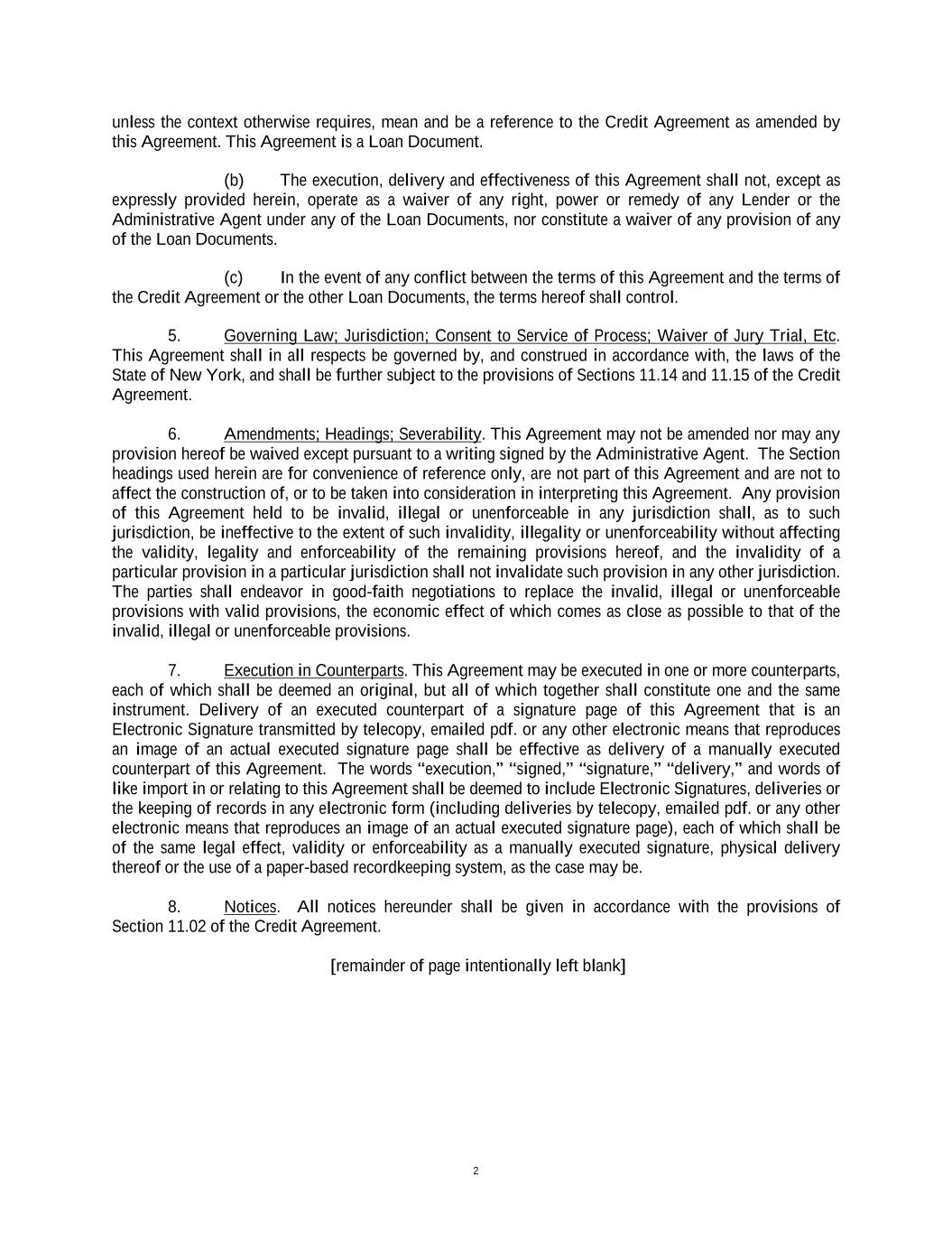 2 unless the context otherwise requires, mean and be a reference to the Credit Agreement as amended by this Agreement. This Agreement is a Loan Document. (b) The execution, delivery and effectiveness of this Agreement shall not, except as expressly provided herein, operate as a waiver of any right, power or remedy of any Lender or the Administrative Agent under any of the Loan Documents, nor constitute a waiver of any provision of any of the Loan Documents. (c) In the event of any conflict between the terms of this Agreement and the terms of the Credit Agreement or the other Loan Documents, the terms hereof shall control. 5. Governing Law; Jurisdiction; Consent to Service of Process; Waiver of Jury Trial, Etc. This Agreement shall in all respects be governed by, and construed in accordance with, the laws of the State of New York, and shall be further subject to the provisions of Sections 11.14 and 11.15 of the Credit Agreement. 6. Amendments; Headings; Severability. This Agreement may not be amended nor may any provision hereof be waived except pursuant to a writing signed by the Administrative Agent. The Section headings used herein are for convenience of reference only, are not part of this Agreement and are not to affect the construction of, or to be taken into consideration in interpreting this Agreement. Any provision of this Agreement held to be invalid, illegal or unenforceable in any jurisdiction shall, as to such jurisdiction, be ineffective to the extent of such invalidity, illegality or unenforceability without affecting the validity, legality and enforceability of the remaining provisions hereof, and the invalidity of a particular provision in a particular jurisdiction shall not invalidate such provision in any other jurisdiction. The parties shall endeavor in good-faith negotiations to replace the invalid, illegal or unenforceable provisions with valid provisions, the economic effect of which comes as close as possible to that of the invalid, illegal or unenforceable provisions. 7. Execution in Counterparts. This Agreement may be executed in one or more counterparts, each of which shall be deemed an original, but all of which together shall constitute one and the same instrument. Delivery of an executed counterpart of a signature page of this Agreement that is an Electronic Signature transmitted by telecopy, emailed pdf. or any other electronic means that reproduces an image of an actual executed signature page shall be effective as delivery of a manually executed counterpart of this Agreement. The words “execution,” “signed,” “signature,” “delivery,” and words of like import in or relating to this Agreement shall be deemed to include Electronic Signatures, deliveries or the keeping of records in any electronic form (including deliveries by telecopy, emailed pdf. or any other electronic means that reproduces an image of an actual executed signature page), each of which shall be of the same legal effect, validity or enforceability as a manually executed signature, physical delivery thereof or the use of a paper-based recordkeeping system, as the case may be. 8. Notices. All notices hereunder shall be given in accordance with the provisions of Section 11.02 of the Credit Agreement. [remainder of page intentionally left blank]
