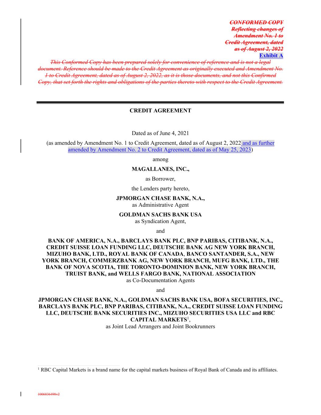 CONFORMED COPY Reflecting changes of Amendment No. 1 to Credit Agreement, dated as of August 2, 2022 Exhibit A This Conformed Copy has been prepared solely for convenience of reference and is not a legal document. Reference should be made to the Credit Agreement as originally executed and Amendment No. 1 to Credit Agreement, dated as of August 2, 2022, as it is those documents, and not this Confirmed Copy, that set forth the rights and obligations of the parties thereto with respect to the Credit Agreement. 1006836498v2 CREDIT AGREEMENT Dated as of June 4, 2021 (as amended by Amendment No. 1 to Credit Agreement, dated as of August 2, 2022 and as further amended by Amendment No. 2 to Credit Agreement, dated as of May 25, 2023) among MAGALLANES, INC., as Borrower, the Lenders party hereto, JPMORGAN CHASE BANK, N.A., as Administrative Agent GOLDMAN SACHS BANK USA as Syndication Agent, and BANK OF AMERICA, N.A., BARCLAYS BANK PLC, BNP PARIBAS, CITIBANK, N.A., CREDIT SUISSE LOAN FUNDING LLC, DEUTSCHE BANK AG NEW YORK BRANCH, MIZUHO BANK, LTD., ROYAL BANK OF CANADA, BANCO SANTANDER, S.A., NEW YORK BRANCH, COMMERZBANK AG, NEW YORK BRANCH, MUFG BANK, LTD., THE BANK OF NOVA SCOTIA, THE TORONTO-DOMINION BANK, NEW YORK BRANCH, TRUIST BANK, and WELLS FARGO BANK, NATIONAL ASSOCIATION as Co-Documentation Agents and JPMORGAN CHASE BANK, N.A., GOLDMAN SACHS BANK USA, BOFA SECURITIES, INC., BARCLAYS BANK PLC, BNP PARIBAS, CITIBANK, N.A., CREDIT SUISSE LOAN FUNDING LLC, DEUTSCHE BANK SECURITIES INC., MIZUHO SECURITIES USA LLC and RBC CAPITAL MARKETS1, as Joint Lead Arrangers and Joint Bookrunners 1 RBC Capital Markets is a brand name for the capital markets business of Royal Bank of Canada and its affiliates.