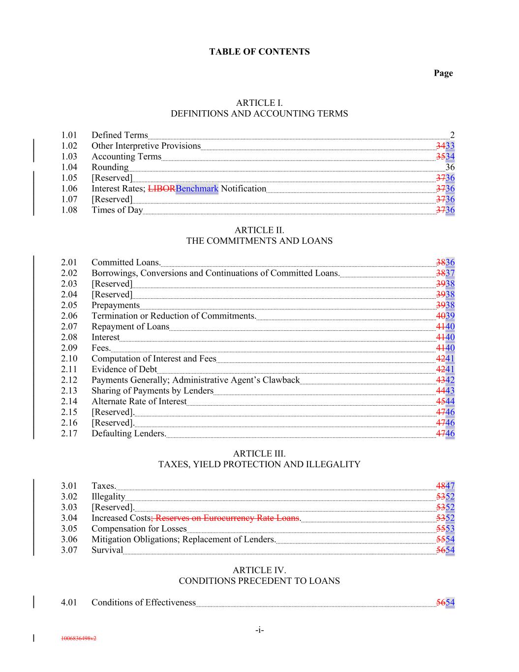 TABLE OF CONTENTS Page -i- 1006836498v2 ARTICLE I. DEFINITIONS AND ACCOUNTING TERMS 1.01 Defined Terms 2 1.02 Other Interpretive Provisions 3433 1.03 Accounting Terms 3534 1.04 Rounding 36 1.05 [Reserved] 3736 1.06 Interest Rates; LIBORBenchmark Notification 3736 1.07 [Reserved] 3736 1.08 Times of Day 3736 ARTICLE II. THE COMMITMENTS AND LOANS 2.01 Committed Loans. 3836 2.02 Borrowings, Conversions and Continuations of Committed Loans. 3837 2.03 [Reserved] 3938 2.04 [Reserved] 3938 2.05 Prepayments 3938 2.06 Termination or Reduction of Commitments. 4039 2.07 Repayment of Loans 4140 2.08 Interest 4140 2.09 Fees. 4140 2.10 Computation of Interest and Fees 4241 2.11 Evidence of Debt 4241 2.12 Payments Generally; Administrative Agent’s Clawback 4342 2.13 Sharing of Payments by Lenders 4443 2.14 Alternate Rate of Interest 4544 2.15 [Reserved]. 4746 2.16 [Reserved]. 4746 2.17 Defaulting Lenders. 4746 ARTICLE III. TAXES, YIELD PROTECTION AND ILLEGALITY 3.01 Taxes. 4847 3.02 Illegality 5352 3.03 [Reserved]. 5352 3.04 Increased Costs; Reserves on Eurocurrency Rate Loans. 5352 3.05 Compensation for Losses 5553 3.06 Mitigation Obligations; Replacement of Lenders. 5554 3.07 Survival 5654 ARTICLE IV. CONDITIONS PRECEDENT TO LOANS 4.01 Conditions of Effectiveness 5654