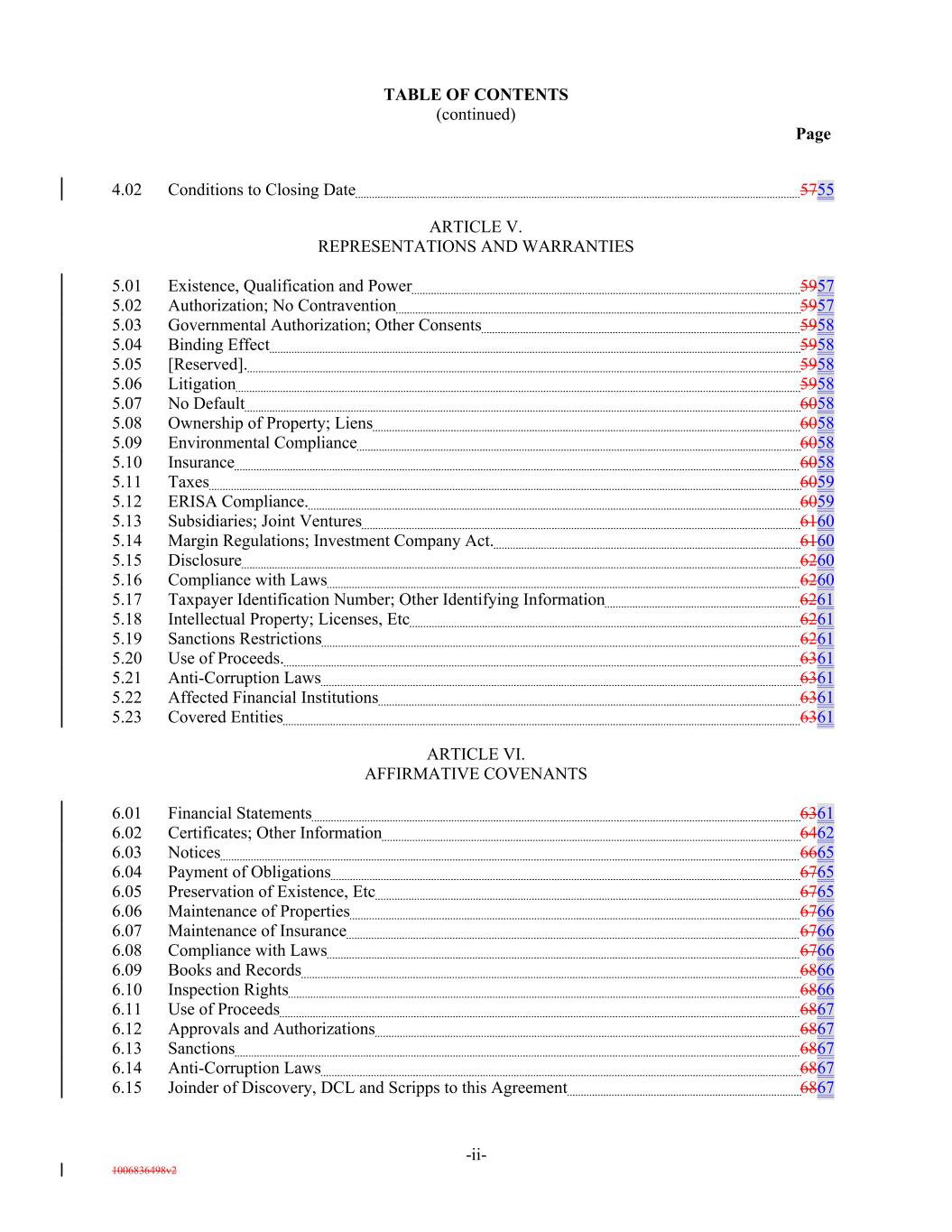 TABLE OF CONTENTS (continued) Page -ii- 1006836498v2 4.02 Conditions to Closing Date 5755 ARTICLE V. REPRESENTATIONS AND WARRANTIES 5.01 Existence, Qualification and Power 5957 5.02 Authorization; No Contravention 5957 5.03 Governmental Authorization; Other Consents 5958 5.04 Binding Effect 5958 5.05 [Reserved]. 5958 5.06 Litigation 5958 5.07 No Default 6058 5.08 Ownership of Property; Liens 6058 5.09 Environmental Compliance 6058 5.10 Insurance 6058 5.11 Taxes 6059 5.12 ERISA Compliance. 6059 5.13 Subsidiaries; Joint Ventures 6160 5.14 Margin Regulations; Investment Company Act. 6160 5.15 Disclosure 6260 5.16 Compliance with Laws 6260 5.17 Taxpayer Identification Number; Other Identifying Information 6261 5.18 Intellectual Property; Licenses, Etc 6261 5.19 Sanctions Restrictions 6261 5.20 Use of Proceeds. 6361 5.21 Anti-Corruption Laws 6361 5.22 Affected Financial Institutions 6361 5.23 Covered Entities 6361 ARTICLE VI. AFFIRMATIVE COVENANTS 6.01 Financial Statements 6361 6.02 Certificates; Other Information 6462 6.03 Notices 6665 6.04 Payment of Obligations 6765 6.05 Preservation of Existence, Etc 6765 6.06 Maintenance of Properties 6766 6.07 Maintenance of Insurance 6766 6.08 Compliance with Laws 6766 6.09 Books and Records 6866 6.10 Inspection Rights 6866 6.11 Use of Proceeds 6867 6.12 Approvals and Authorizations 6867 6.13 Sanctions 6867 6.14 Anti-Corruption Laws 6867 6.15 Joinder of Discovery, DCL and Scripps to this Agreement 6867