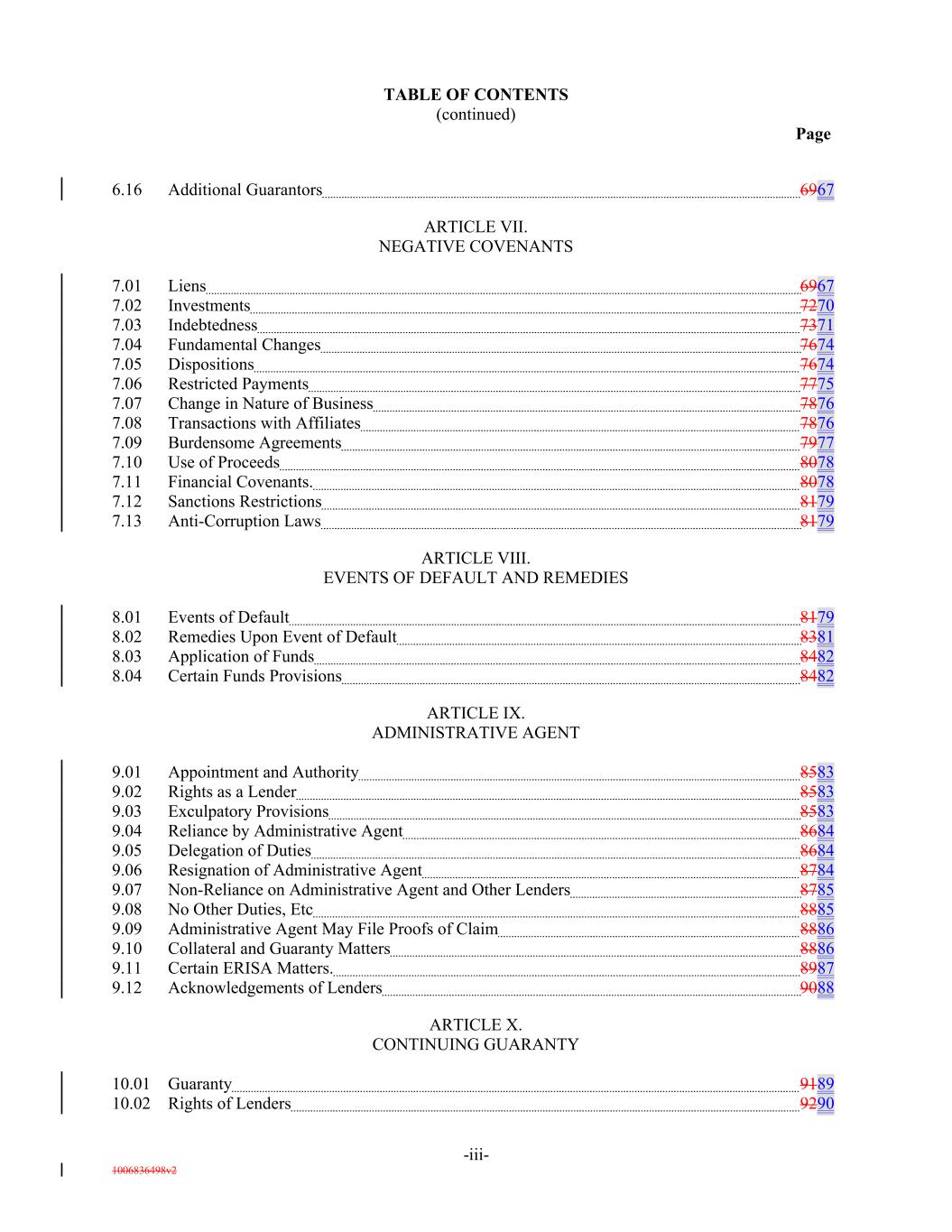 TABLE OF CONTENTS (continued) Page -iii- 1006836498v2 6.16 Additional Guarantors 6967 ARTICLE VII. NEGATIVE COVENANTS 7.01 Liens 6967 7.02 Investments 7270 7.03 Indebtedness 7371 7.04 Fundamental Changes 7674 7.05 Dispositions 7674 7.06 Restricted Payments 7775 7.07 Change in Nature of Business 7876 7.08 Transactions with Affiliates 7876 7.09 Burdensome Agreements 7977 7.10 Use of Proceeds 8078 7.11 Financial Covenants. 8078 7.12 Sanctions Restrictions 8179 7.13 Anti-Corruption Laws 8179 ARTICLE VIII. EVENTS OF DEFAULT AND REMEDIES 8.01 Events of Default 8179 8.02 Remedies Upon Event of Default 8381 8.03 Application of Funds 8482 8.04 Certain Funds Provisions 8482 ARTICLE IX. ADMINISTRATIVE AGENT 9.01 Appointment and Authority 8583 9.02 Rights as a Lender 8583 9.03 Exculpatory Provisions 8583 9.04 Reliance by Administrative Agent 8684 9.05 Delegation of Duties 8684 9.06 Resignation of Administrative Agent 8784 9.07 Non-Reliance on Administrative Agent and Other Lenders 8785 9.08 No Other Duties, Etc 8885 9.09 Administrative Agent May File Proofs of Claim 8886 9.10 Collateral and Guaranty Matters 8886 9.11 Certain ERISA Matters. 8987 9.12 Acknowledgements of Lenders 9088 ARTICLE X. CONTINUING GUARANTY 10.01 Guaranty 9189 10.02 Rights of Lenders 9290