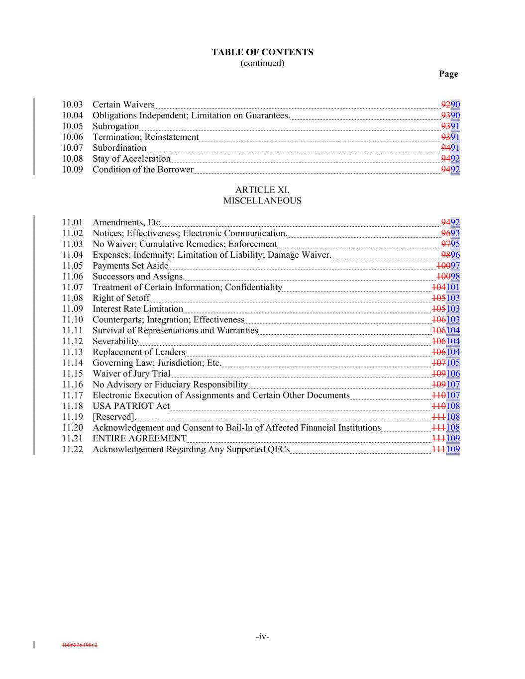 TABLE OF CONTENTS (continued) Page -iv- 1006836498v2 10.03 Certain Waivers 9290 10.04 Obligations Independent; Limitation on Guarantees. 9390 10.05 Subrogation 9391 10.06 Termination; Reinstatement 9391 10.07 Subordination 9491 10.08 Stay of Acceleration 9492 10.09 Condition of the Borrower 9492 ARTICLE XI. MISCELLANEOUS 11.01 Amendments, Etc 9492 11.02 Notices; Effectiveness; Electronic Communication. 9693 11.03 No Waiver; Cumulative Remedies; Enforcement 9795 11.04 Expenses; Indemnity; Limitation of Liability; Damage Waiver. 9896 11.05 Payments Set Aside 10097 11.06 Successors and Assigns. 10098 11.07 Treatment of Certain Information; Confidentiality 104101 11.08 Right of Setoff 105103 11.09 Interest Rate Limitation 105103 11.10 Counterparts; Integration; Effectiveness 106103 11.11 Survival of Representations and Warranties 106104 11.12 Severability 106104 11.13 Replacement of Lenders 106104 11.14 Governing Law; Jurisdiction; Etc. 107105 11.15 Waiver of Jury Trial 109106 11.16 No Advisory or Fiduciary Responsibility 109107 11.17 Electronic Execution of Assignments and Certain Other Documents 110107 11.18 USA PATRIOT Act 110108 11.19 [Reserved]. 111108 11.20 Acknowledgement and Consent to Bail-In of Affected Financial Institutions 111108 11.21 ENTIRE AGREEMENT 111109 11.22 Acknowledgement Regarding Any Supported QFCs 111109