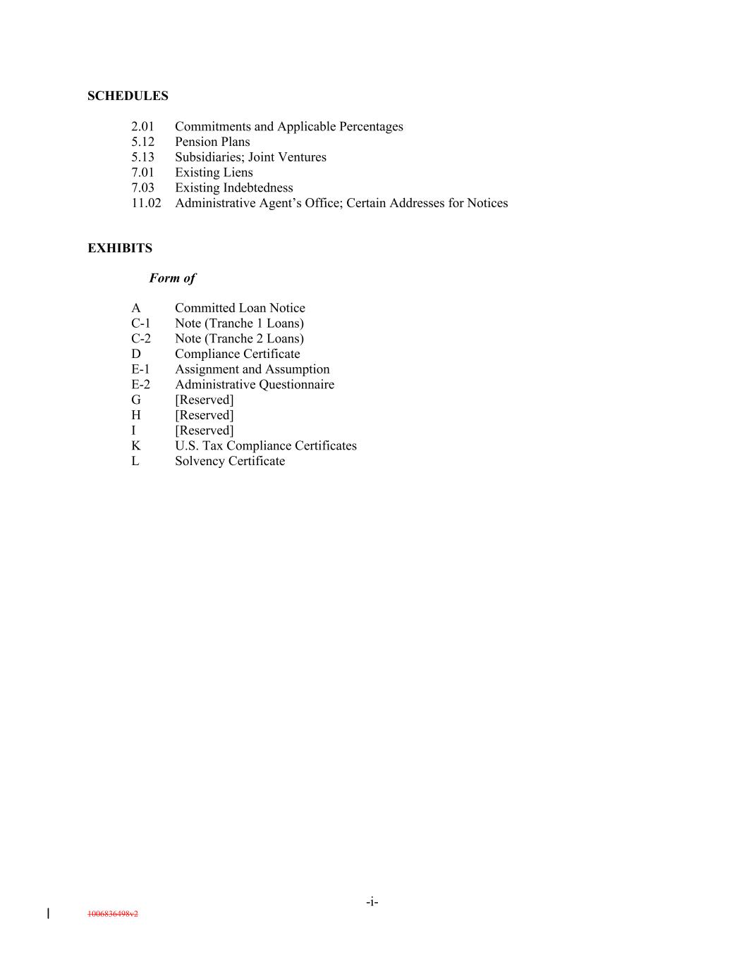 -i- 1006836498v2 SCHEDULES 2.01 Commitments and Applicable Percentages 5.12 Pension Plans 5.13 Subsidiaries; Joint Ventures 7.01 Existing Liens 7.03 Existing Indebtedness 11.02 Administrative Agent’s Office; Certain Addresses for Notices EXHIBITS Form of A Committed Loan Notice C-1 Note (Tranche 1 Loans) C-2 Note (Tranche 2 Loans) D Compliance Certificate E-1 Assignment and Assumption E-2 Administrative Questionnaire G [Reserved] H [Reserved] I [Reserved] K U.S. Tax Compliance Certificates L Solvency Certificate