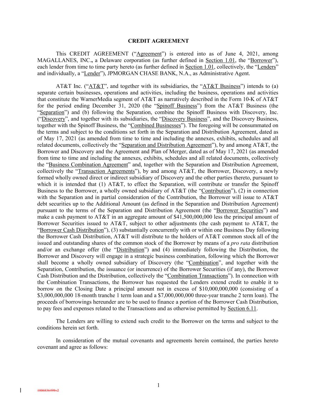 CREDIT AGREEMENT This CREDIT AGREEMENT (“Agreement”) is entered into as of June 4, 2021, among MAGALLANES, INC., a Delaware corporation (as further defined in Section 1.01, the “Borrower”), each lender from time to time party hereto (as further defined in Section 1.01, collectively, the “Lenders” and individually, a “Lender”), JPMORGAN CHASE BANK, N.A., as Administrative Agent. AT&T Inc. (“AT&T”, and together with its subsidiaries, the “AT&T Business”) intends to (a) separate certain businesses, operations and activities, including the business, operations and activities that constitute the WarnerMedia segment of AT&T as narratively described in the Form 10-K of AT&T for the period ending December 31, 2020 (the “Spinoff Business”) from the AT&T Business (the “Separation”) and (b) following the Separation, combine the Spinoff Business with Discovery, Inc. (“Discovery”, and together with its subsidiaries, the “Discovery Business”, and the Discovery Business, together with the Spinoff Business, the “Combined Businesses”). The foregoing will be consummated on the terms and subject to the conditions set forth in the Separation and Distribution Agreement, dated as of May 17, 2021 (as amended from time to time and including the annexes, exhibits, schedules and all related documents, collectively the “Separation and Distribution Agreement”), by and among AT&T, the Borrower and Discovery and the Agreement and Plan of Merger, dated as of May 17, 2021 (as amended from time to time and including the annexes, exhibits, schedules and all related documents, collectively the “Business Combination Agreement” and, together with the Separation and Distribution Agreement, collectively the “Transaction Agreements”), by and among AT&T, the Borrower, Discovery, a newly formed wholly owned direct or indirect subsidiary of Discovery and the other parties thereto, pursuant to which it is intended that (1) AT&T, to effect the Separation, will contribute or transfer the Spinoff Business to the Borrower, a wholly owned subsidiary of AT&T (the “Contribution”), (2) in connection with the Separation and in partial consideration of the Contribution, the Borrower will issue to AT&T debt securities up to the Additional Amount (as defined in the Separation and Distribution Agreement) pursuant to the terms of the Separation and Distribution Agreement (the “Borrower Securities”) and make a cash payment to AT&T in an aggregate amount of $41,500,000,000 less the principal amount of Borrower Securities issued to AT&T, subject to other adjustments (the cash payment to AT&T, the “Borrower Cash Distribution”), (3) substantially concurrently with or within one Business Day following the Borrower Cash Distribution, AT&T will distribute to the holders of AT&T common stock all of the issued and outstanding shares of the common stock of the Borrower by means of a pro rata distribution and/or an exchange offer (the “Distribution”) and (4) immediately following the Distribution, the Borrower and Discovery will engage in a strategic business combination, following which the Borrower shall become a wholly owned subsidiary of Discovery (the “Combination”, and together with the Separation, Contribution, the issuance (or incurrence) of the Borrower Securities (if any), the Borrower Cash Distribution and the Distribution, collectively the “Combination Transactions”). In connection with the Combination Transactions, the Borrower has requested the Lenders extend credit to enable it to borrow on the Closing Date a principal amount not in excess of $10,000,000,000 (consisting of a $3,000,000,000 18-month tranche 1 term loan and a $7,000,000,000 three-year tranche 2 term loan). The proceeds of borrowings hereunder are to be used to finance a portion of the Borrower Cash Distribution, to pay fees and expenses related to the Transactions and as otherwise permitted by Section 6.11. The Lenders are willing to extend such credit to the Borrower on the terms and subject to the conditions herein set forth. In consideration of the mutual covenants and agreements herein contained, the parties hereto covenant and agree as follows: 1 1006836498v2