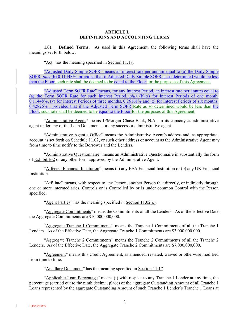 ARTICLE I. DEFINITIONS AND ACCOUNTING TERMS 1.01 Defined Terms. As used in this Agreement, the following terms shall have the meanings set forth below: “Act” has the meaning specified in Section 11.18. “Adjusted Daily Simple SOFR” means an interest rate per annum equal to (a) the Daily Simple SOFR, plus (b) 0.11448%; provided that if Adjusted Daily Simple SOFR as so determined would be less than the Floor, such rate shall be deemed to be equal to the Floor for the purposes of this Agreement. “Adjusted Term SOFR Rate” means, for any Interest Period, an interest rate per annum equal to (a) the Term SOFR Rate for such Interest Period, plus (b)(x) for Interest Periods of one month, 0.11448%, (y) for Interest Periods of three months, 0.26161% and (z) for Interest Periods of six months, 0.42826% ; provided that if the Adjusted Term SOFR Rate as so determined would be less than the Floor, such rate shall be deemed to be equal to the Floor for the purposes of this Agreement. “Administrative Agent” means JPMorgan Chase Bank, N.A., in its capacity as administrative agent under any of the Loan Documents, or any successor administrative agent. “Administrative Agent’s Office” means the Administrative Agent’s address and, as appropriate, account as set forth on Schedule 11.02, or such other address or account as the Administrative Agent may from time to time notify to the Borrower and the Lenders. “Administrative Questionnaire” means an Administrative Questionnaire in substantially the form of Exhibit E-2 or any other form approved by the Administrative Agent. “Affected Financial Institution” means (a) any EEA Financial Institution or (b) any UK Financial Institution. “Affiliate” means, with respect to any Person, another Person that directly, or indirectly through one or more intermediaries, Controls or is Controlled by or is under common Control with the Person specified. “Agent Parties” has the meaning specified in Section 11.02(c). “Aggregate Commitments” means the Commitments of all the Lenders. As of the Effective Date, the Aggregate Commitments are $10,000,000,000. “Aggregate Tranche 1 Commitments” means the Tranche 1 Commitments of all the Tranche 1 Lenders. As of the Effective Date, the Aggregate Tranche 1 Commitments are $3,000,000,000. “Aggregate Tranche 2 Commitments” means the Tranche 2 Commitments of all the Tranche 2 Lenders. As of the Effective Date, the Aggregate Tranche 2 Commitments are $7,000,000,000. “Agreement” means this Credit Agreement, as amended, restated, waived or otherwise modified from time to time. “Ancillary Document” has the meaning specified in Section 11.17. “Applicable Loan Percentage” means (i) with respect to any Tranche 1 Lender at any time, the percentage (carried out to the ninth decimal place) of the aggregate Outstanding Amount of all Tranche 1 Loans represented by the aggregate Outstanding Amount of such Tranche 1 Lender’s Tranche 1 Loans at 2 1006836498v2