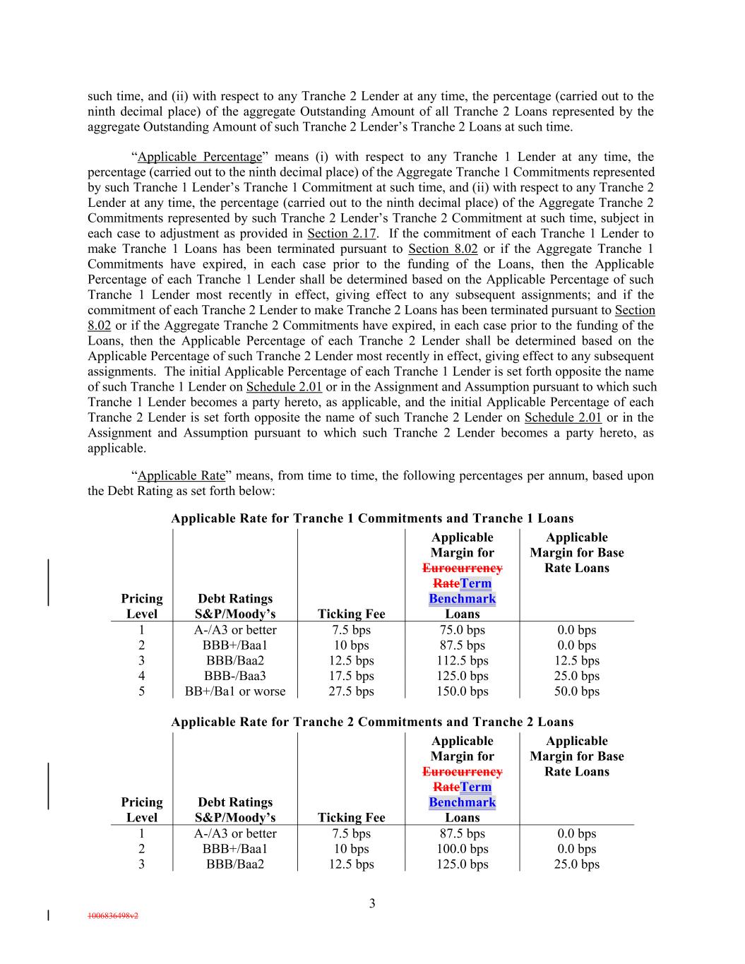 3 1006836498v2 25.0 bps 2 Applicable Margin for Base Rate Loans 5 BBB+/Baa1 BB+/Ba1 or worse Pricing Level 27.5 bps 10 bps 150.0 bps 50.0 bps 87.5 bps Applicable Rate for Tranche 2 Commitments and Tranche 2 Loans Pricing Level 0.0 bps Debt Ratings S&P/Moody’s 1 Ticking Fee Applicable Margin for Eurocurrency RateTerm Benchmark Loans Debt Ratings S&P/Moody’s Applicable Margin for Base Rate Loans 3 A-/A3 or better 1 BBB/Baa2 A-/A3 or better such time, and (ii) with respect to any Tranche 2 Lender at any time, the percentage (carried out to the ninth decimal place) of the aggregate Outstanding Amount of all Tranche 2 Loans represented by the aggregate Outstanding Amount of such Tranche 2 Lender’s Tranche 2 Loans at such time. “Applicable Percentage” means (i) with respect to any Tranche 1 Lender at any time, the percentage (carried out to the ninth decimal place) of the Aggregate Tranche 1 Commitments represented by such Tranche 1 Lender’s Tranche 1 Commitment at such time, and (ii) with respect to any Tranche 2 Lender at any time, the percentage (carried out to the ninth decimal place) of the Aggregate Tranche 2 Commitments represented by such Tranche 2 Lender’s Tranche 2 Commitment at such time, subject in each case to adjustment as provided in Section 2.17. If the commitment of each Tranche 1 Lender to make Tranche 1 Loans has been terminated pursuant to Section 8.02 or if the Aggregate Tranche 1 Commitments have expired, in each case prior to the funding of the Loans, then the Applicable Percentage of each Tranche 1 Lender shall be determined based on the Applicable Percentage of such Tranche 1 Lender most recently in effect, giving effect to any subsequent assignments; and if the commitment of each Tranche 2 Lender to make Tranche 2 Loans has been terminated pursuant to Section 8.02 or if the Aggregate Tranche 2 Commitments have expired, in each case prior to the funding of the Loans, then the Applicable Percentage of each Tranche 2 Lender shall be determined based on the Applicable Percentage of such Tranche 2 Lender most recently in effect, giving effect to any subsequent assignments. The initial Applicable Percentage of each Tranche 1 Lender is set forth opposite the name of such Tranche 1 Lender on Schedule 2.01 or in the Assignment and Assumption pursuant to which such Tranche 1 Lender becomes a party hereto, as applicable, and the initial Applicable Percentage of each Tranche 2 Lender is set forth opposite the name of such Tranche 2 Lender on Schedule 2.01 or in the Assignment and Assumption pursuant to which such Tranche 2 Lender becomes a party hereto, as applicable. “Applicable Rate” means, from time to time, the following percentages per annum, based upon the Debt Rating as set forth below: Applicable Rate for Tranche 1 Commitments and Tranche 1 Loans 7.5 bps 12.5 bps 87.5 bps 7.5 bps 0.0 bps 112.5 bps Ticking Fee 2 12.5 bps BBB+/Baa1 75.0 bps 10 bps 100.0 bps 0.0 bps 4 0.0 bps 3 BBB-/Baa3 BBB/Baa2 Applicable Margin for Eurocurrency RateTerm Benchmark Loans 12.5 bps 17.5 bps 125.0 bps 25.0 bps 125.0 bps
