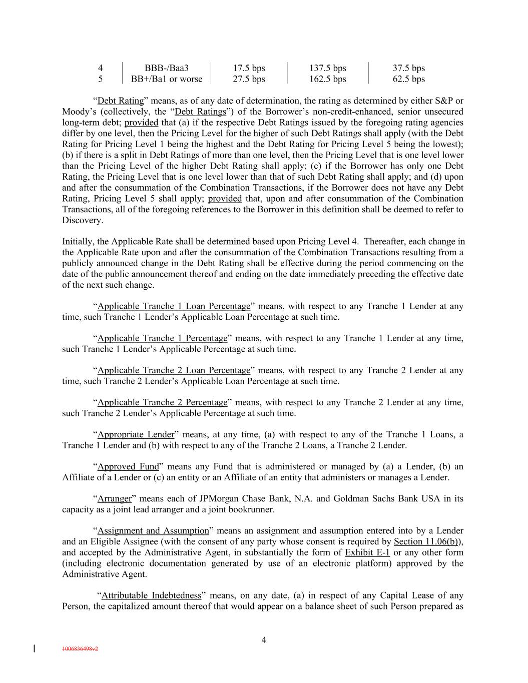 4 1006836498v2 BBB-/Baa3 5 BB+/Ba1 or worse 17.5 bps 27.5 bps 162.5 bps 137.5 bps 62.5 bps 4 “Debt Rating” means, as of any date of determination, the rating as determined by either S&P or Moody’s (collectively, the “Debt Ratings”) of the Borrower’s non-credit-enhanced, senior unsecured long-term debt; provided that (a) if the respective Debt Ratings issued by the foregoing rating agencies differ by one level, then the Pricing Level for the higher of such Debt Ratings shall apply (with the Debt Rating for Pricing Level 1 being the highest and the Debt Rating for Pricing Level 5 being the lowest); (b) if there is a split in Debt Ratings of more than one level, then the Pricing Level that is one level lower than the Pricing Level of the higher Debt Rating shall apply; (c) if the Borrower has only one Debt Rating, the Pricing Level that is one level lower than that of such Debt Rating shall apply; and (d) upon and after the consummation of the Combination Transactions, if the Borrower does not have any Debt Rating, Pricing Level 5 shall apply; provided that, upon and after consummation of the Combination Transactions, all of the foregoing references to the Borrower in this definition shall be deemed to refer to Discovery. Initially, the Applicable Rate shall be determined based upon Pricing Level 4. Thereafter, each change in the Applicable Rate upon and after the consummation of the Combination Transactions resulting from a publicly announced change in the Debt Rating shall be effective during the period commencing on the date of the public announcement thereof and ending on the date immediately preceding the effective date of the next such change. “Applicable Tranche 1 Loan Percentage” means, with respect to any Tranche 1 Lender at any time, such Tranche 1 Lender’s Applicable Loan Percentage at such time. “Applicable Tranche 1 Percentage” means, with respect to any Tranche 1 Lender at any time, such Tranche 1 Lender’s Applicable Percentage at such time. “Applicable Tranche 2 Loan Percentage” means, with respect to any Tranche 2 Lender at any time, such Tranche 2 Lender’s Applicable Loan Percentage at such time. “Applicable Tranche 2 Percentage” means, with respect to any Tranche 2 Lender at any time, such Tranche 2 Lender’s Applicable Percentage at such time. “Appropriate Lender” means, at any time, (a) with respect to any of the Tranche 1 Loans, a Tranche 1 Lender and (b) with respect to any of the Tranche 2 Loans, a Tranche 2 Lender. “Approved Fund” means any Fund that is administered or managed by (a) a Lender, (b) an Affiliate of a Lender or (c) an entity or an Affiliate of an entity that administers or manages a Lender. “Arranger” means each of JPMorgan Chase Bank, N.A. and Goldman Sachs Bank USA in its capacity as a joint lead arranger and a joint bookrunner. “Assignment and Assumption” means an assignment and assumption entered into by a Lender and an Eligible Assignee (with the consent of any party whose consent is required by Section 11.06(b)), and accepted by the Administrative Agent, in substantially the form of Exhibit E-1 or any other form (including electronic documentation generated by use of an electronic platform) approved by the Administrative Agent. “Attributable Indebtedness” means, on any date, (a) in respect of any Capital Lease of any Person, the capitalized amount thereof that would appear on a balance sheet of such Person prepared as 37.5 bps