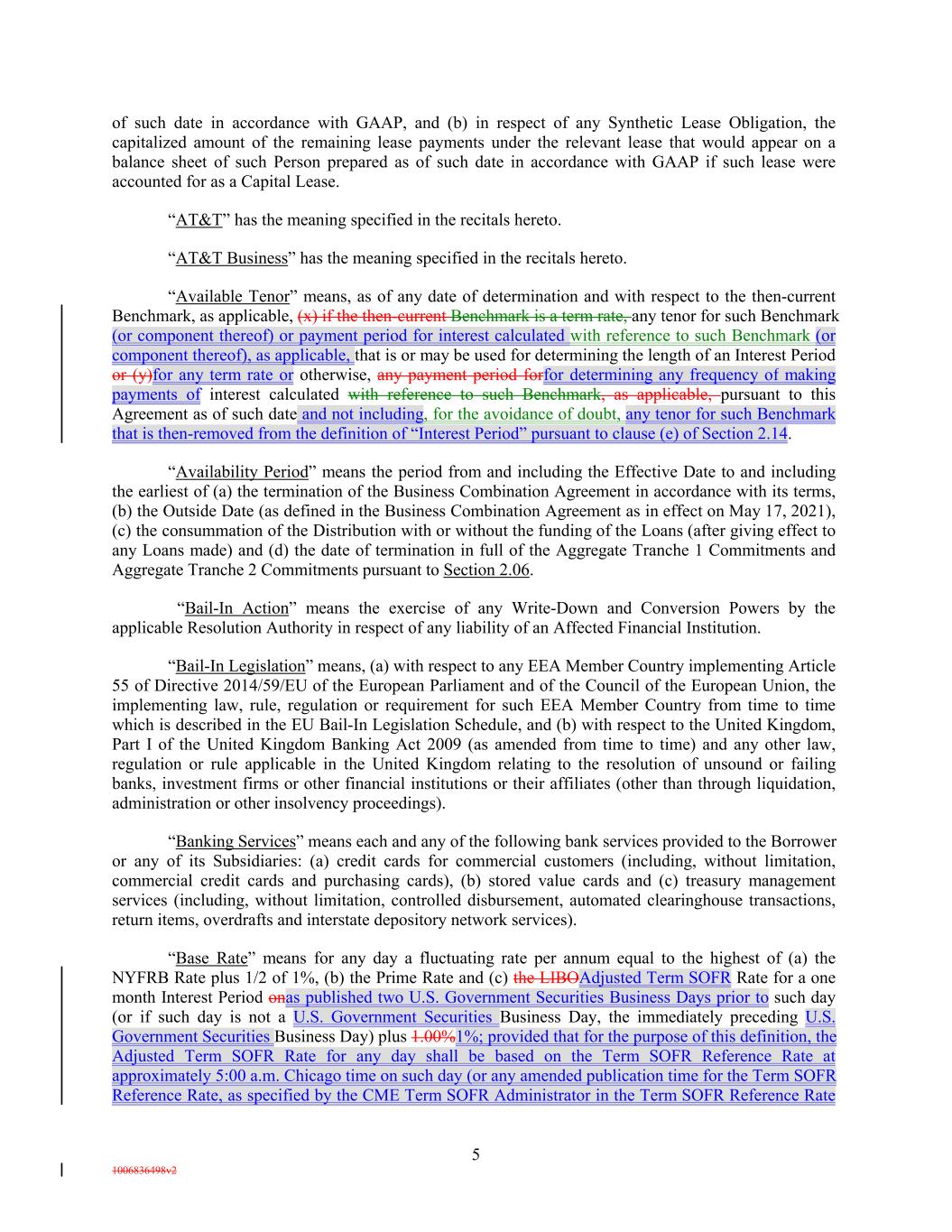 of such date in accordance with GAAP, and (b) in respect of any Synthetic Lease Obligation, the capitalized amount of the remaining lease payments under the relevant lease that would appear on a balance sheet of such Person prepared as of such date in accordance with GAAP if such lease were accounted for as a Capital Lease. “AT&T” has the meaning specified in the recitals hereto. “AT&T Business” has the meaning specified in the recitals hereto. “Available Tenor” means, as of any date of determination and with respect to the then-current Benchmark, as applicable, (x) if the then-current Benchmark is a term rate, any tenor for such Benchmark (or component thereof) or payment period for interest calculated with reference to such Benchmark (or component thereof), as applicable, that is or may be used for determining the length of an Interest Period or (y)for any term rate or otherwise, any payment period forfor determining any frequency of making payments of interest calculated with reference to such Benchmark, as applicable, pursuant to this Agreement as of such date and not including, for the avoidance of doubt, any tenor for such Benchmark that is then-removed from the definition of “Interest Period” pursuant to clause (e) of Section 2.14. “Availability Period” means the period from and including the Effective Date to and including the earliest of (a) the termination of the Business Combination Agreement in accordance with its terms, (b) the Outside Date (as defined in the Business Combination Agreement as in effect on May 17, 2021), (c) the consummation of the Distribution with or without the funding of the Loans (after giving effect to any Loans made) and (d) the date of termination in full of the Aggregate Tranche 1 Commitments and Aggregate Tranche 2 Commitments pursuant to Section 2.06. “Bail-In Action” means the exercise of any Write-Down and Conversion Powers by the applicable Resolution Authority in respect of any liability of an Affected Financial Institution. “Bail-In Legislation” means, (a) with respect to any EEA Member Country implementing Article 55 of Directive 2014/59/EU of the European Parliament and of the Council of the European Union, the implementing law, rule, regulation or requirement for such EEA Member Country from time to time which is described in the EU Bail-In Legislation Schedule, and (b) with respect to the United Kingdom, Part I of the United Kingdom Banking Act 2009 (as amended from time to time) and any other law, regulation or rule applicable in the United Kingdom relating to the resolution of unsound or failing banks, investment firms or other financial institutions or their affiliates (other than through liquidation, administration or other insolvency proceedings). “Banking Services” means each and any of the following bank services provided to the Borrower or any of its Subsidiaries: (a) credit cards for commercial customers (including, without limitation, commercial credit cards and purchasing cards), (b) stored value cards and (c) treasury management services (including, without limitation, controlled disbursement, automated clearinghouse transactions, return items, overdrafts and interstate depository network services). “Base Rate” means for any day a fluctuating rate per annum equal to the highest of (a) the NYFRB Rate plus 1/2 of 1%, (b) the Prime Rate and (c) the LIBOAdjusted Term SOFR Rate for a one month Interest Period onas published two U.S. Government Securities Business Days prior to such day (or if such day is not a U.S. Government Securities Business Day, the immediately preceding U.S. Government Securities Business Day) plus 1.00%1%; provided that for the purpose of this definition, the Adjusted Term SOFR Rate for any day shall be based on the Term SOFR Reference Rate at approximately 5:00 a.m. Chicago time on such day (or any amended publication time for the Term SOFR Reference Rate, as specified by the CME Term SOFR Administrator in the Term SOFR Reference Rate 5 1006836498v2