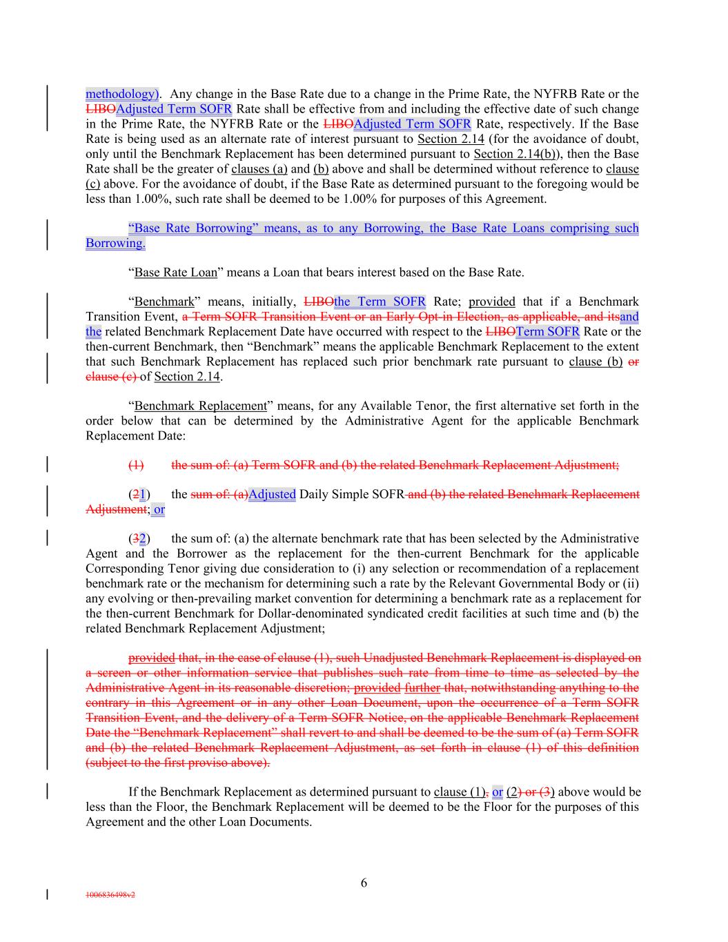 methodology). Any change in the Base Rate due to a change in the Prime Rate, the NYFRB Rate or the LIBOAdjusted Term SOFR Rate shall be effective from and including the effective date of such change in the Prime Rate, the NYFRB Rate or the LIBOAdjusted Term SOFR Rate, respectively. If the Base Rate is being used as an alternate rate of interest pursuant to Section 2.14 (for the avoidance of doubt, only until the Benchmark Replacement has been determined pursuant to Section 2.14(b)), then the Base Rate shall be the greater of clauses (a) and (b) above and shall be determined without reference to clause (c) above. For the avoidance of doubt, if the Base Rate as determined pursuant to the foregoing would be less than 1.00%, such rate shall be deemed to be 1.00% for purposes of this Agreement. “Base Rate Borrowing” means, as to any Borrowing, the Base Rate Loans comprising such Borrowing. “Base Rate Loan” means a Loan that bears interest based on the Base Rate. “Benchmark” means, initially, LIBOthe Term SOFR Rate; provided that if a Benchmark Transition Event, a Term SOFR Transition Event or an Early Opt-in Election, as applicable, and itsand the related Benchmark Replacement Date have occurred with respect to the LIBOTerm SOFR Rate or the then-current Benchmark, then “Benchmark” means the applicable Benchmark Replacement to the extent that such Benchmark Replacement has replaced such prior benchmark rate pursuant to clause (b) or clause (c) of Section 2.14. “Benchmark Replacement” means, for any Available Tenor, the first alternative set forth in the order below that can be determined by the Administrative Agent for the applicable Benchmark Replacement Date: (1) the sum of: (a) Term SOFR and (b) the related Benchmark Replacement Adjustment; (21) the sum of: (a)Adjusted Daily Simple SOFR and (b) the related Benchmark Replacement Adjustment; or (32) the sum of: (a) the alternate benchmark rate that has been selected by the Administrative Agent and the Borrower as the replacement for the then-current Benchmark for the applicable Corresponding Tenor giving due consideration to (i) any selection or recommendation of a replacement benchmark rate or the mechanism for determining such a rate by the Relevant Governmental Body or (ii) any evolving or then-prevailing market convention for determining a benchmark rate as a replacement for the then-current Benchmark for Dollar-denominated syndicated credit facilities at such time and (b) the related Benchmark Replacement Adjustment; provided that, in the case of clause (1), such Unadjusted Benchmark Replacement is displayed on a screen or other information service that publishes such rate from time to time as selected by the Administrative Agent in its reasonable discretion; provided further that, notwithstanding anything to the contrary in this Agreement or in any other Loan Document, upon the occurrence of a Term SOFR Transition Event, and the delivery of a Term SOFR Notice, on the applicable Benchmark Replacement Date the “Benchmark Replacement” shall revert to and shall be deemed to be the sum of (a) Term SOFR and (b) the related Benchmark Replacement Adjustment, as set forth in clause (1) of this definition (subject to the first proviso above). If the Benchmark Replacement as determined pursuant to clause (1), or (2) or (3) above would be less than the Floor, the Benchmark Replacement will be deemed to be the Floor for the purposes of this Agreement and the other Loan Documents. 6 1006836498v2